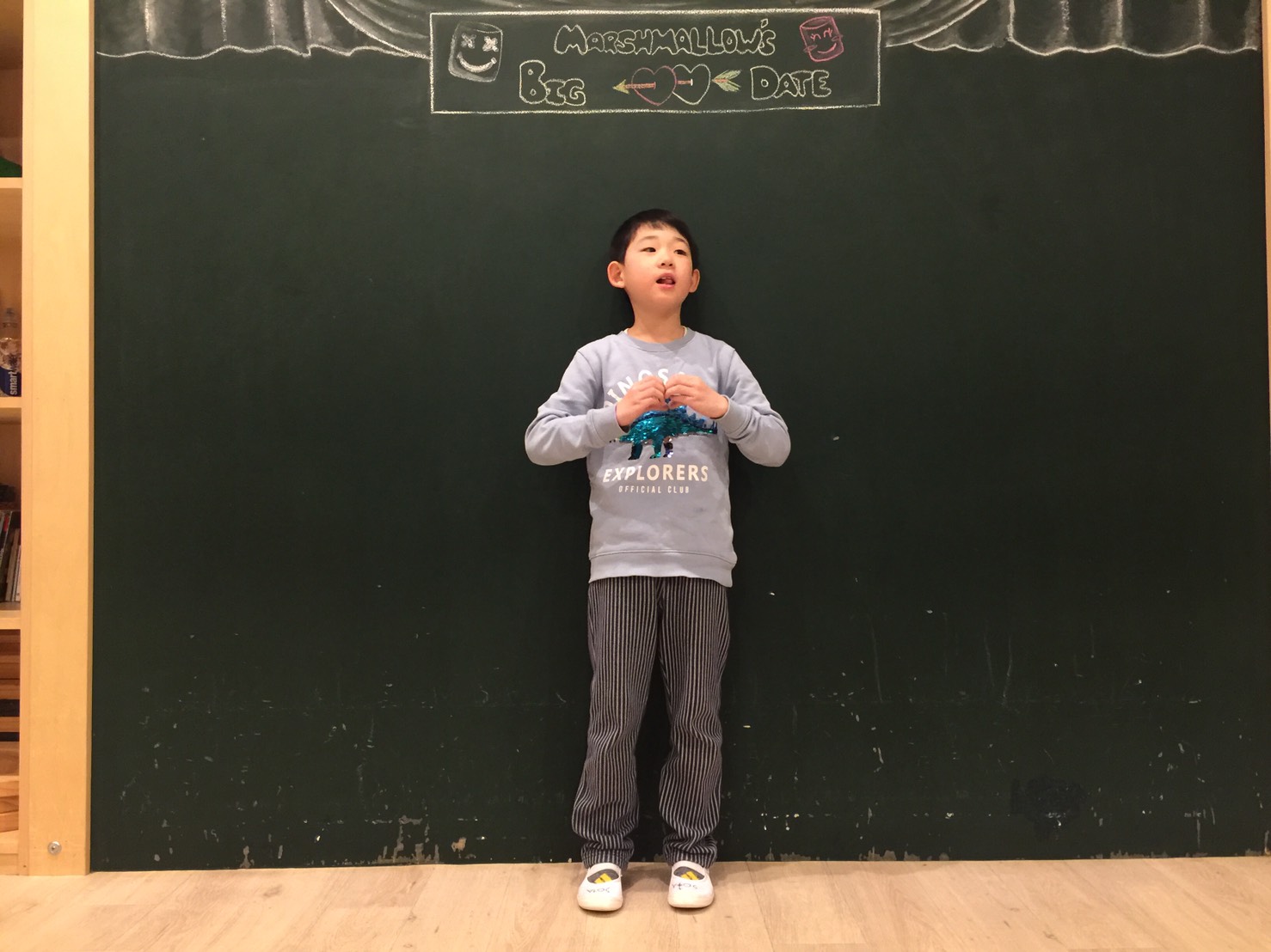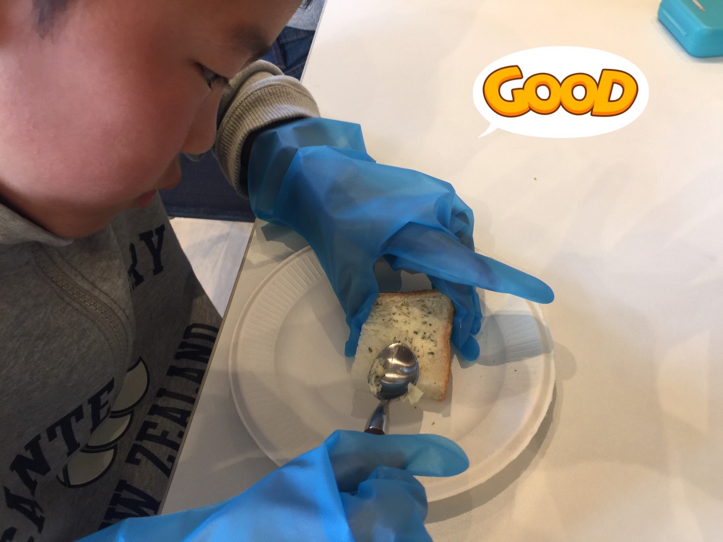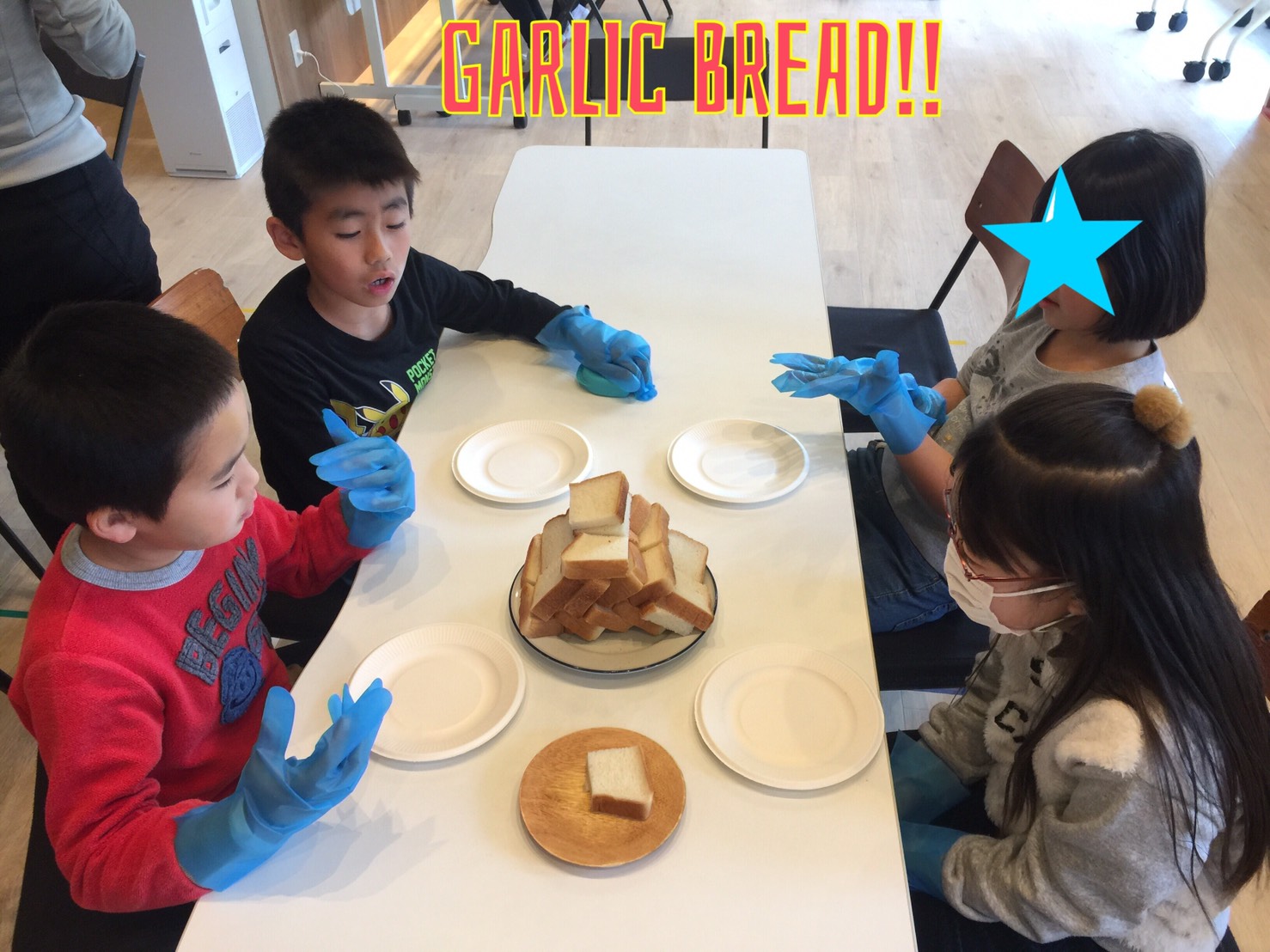 先生:”We are going to make garlic bread today.”(今日はガーリックブレッドを作るよ)