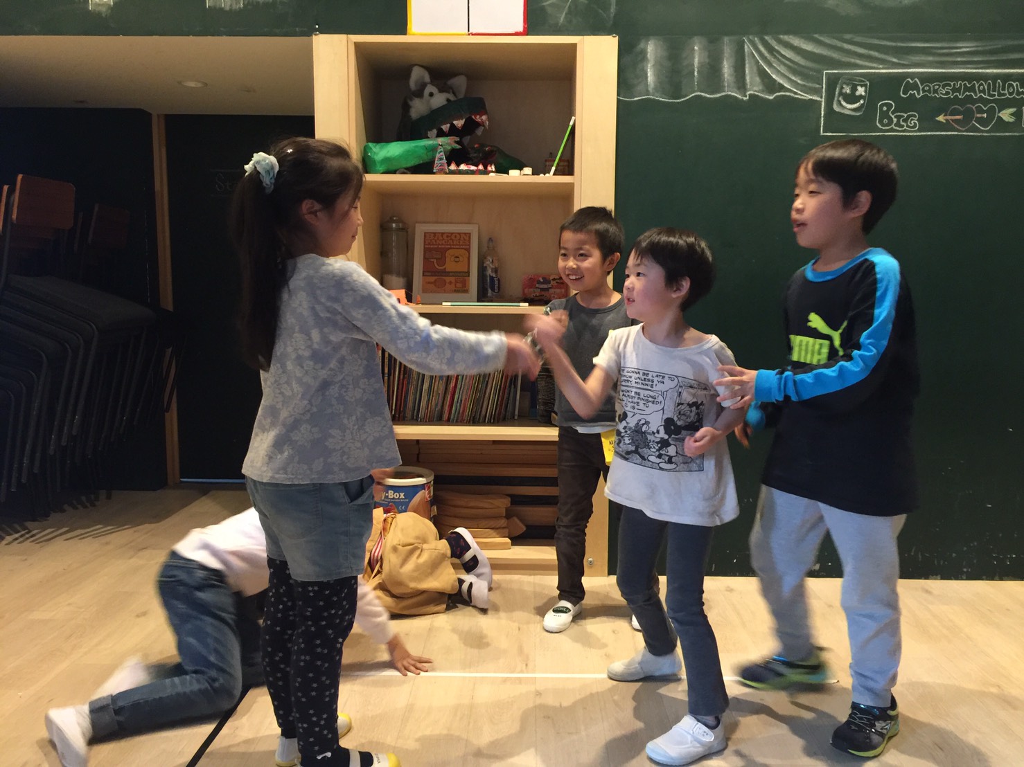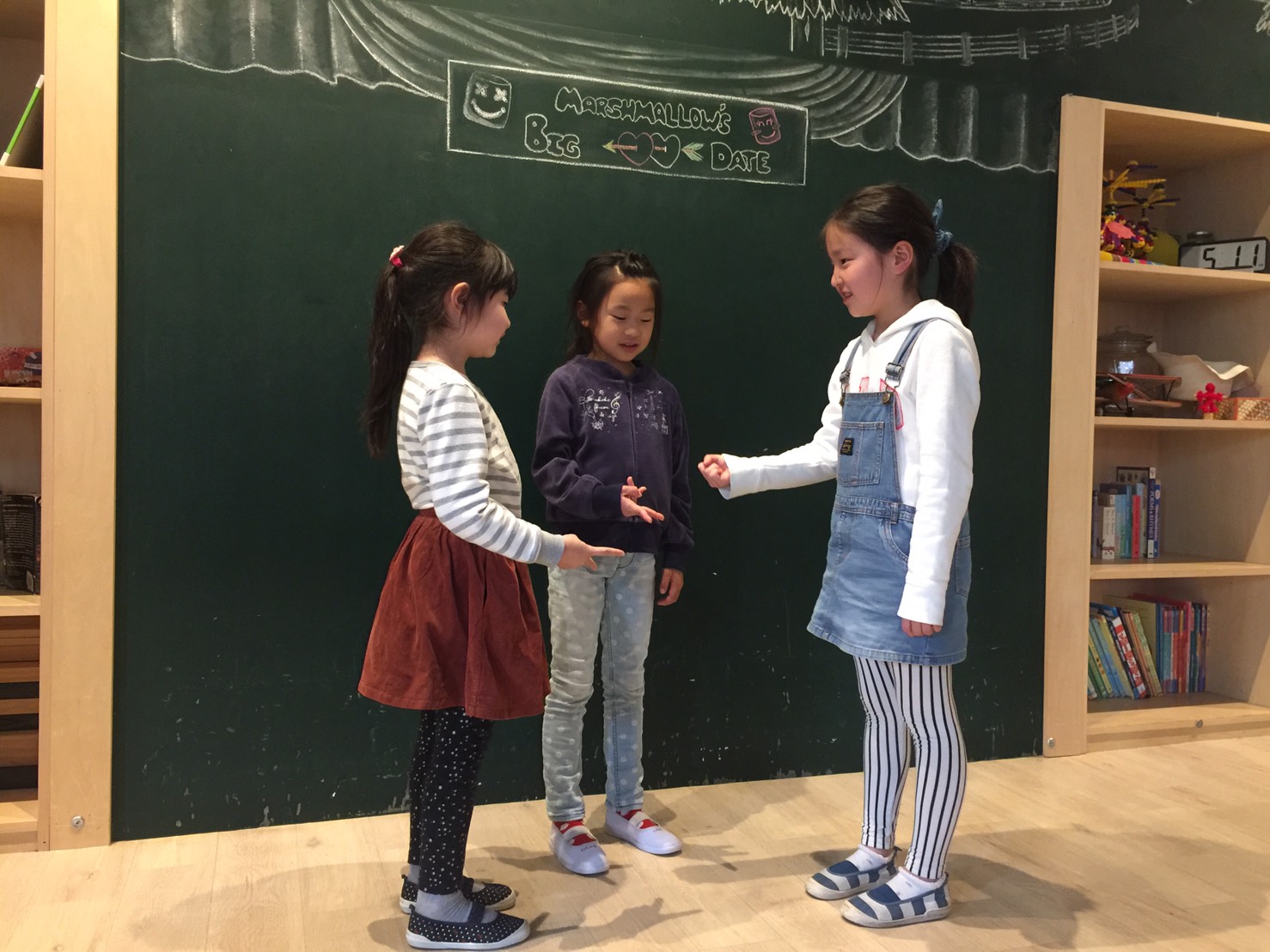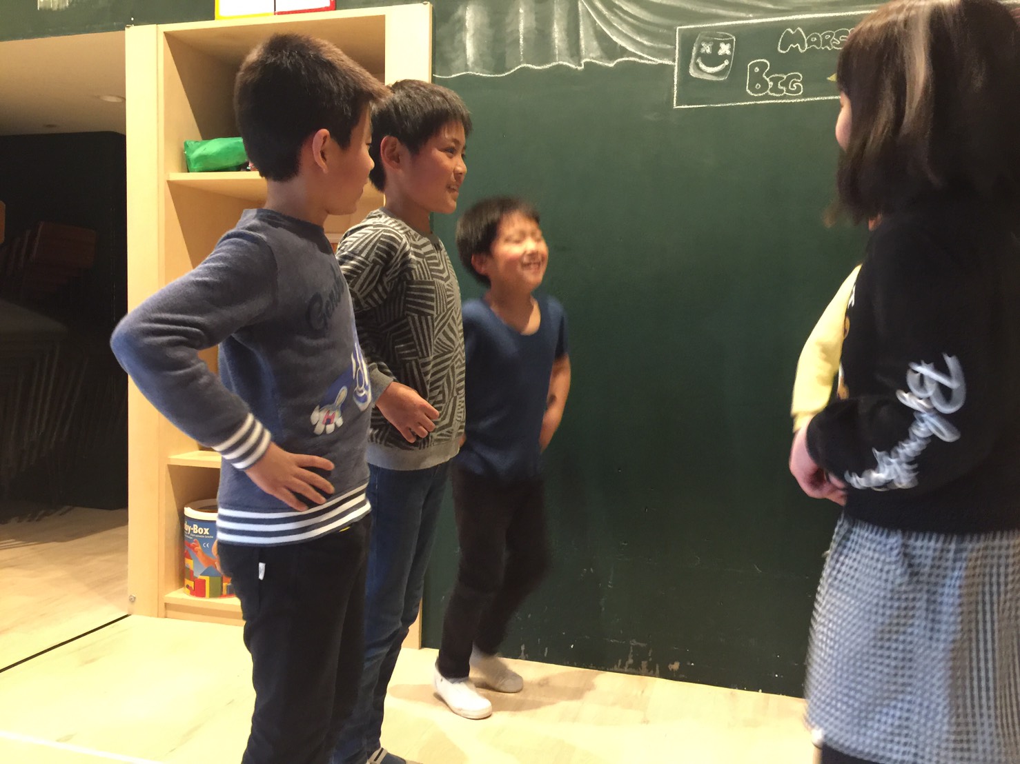 Dialogueの時間も、みんなでストーリーを考えて発表。セリフもひとりひとりに割り振られています。