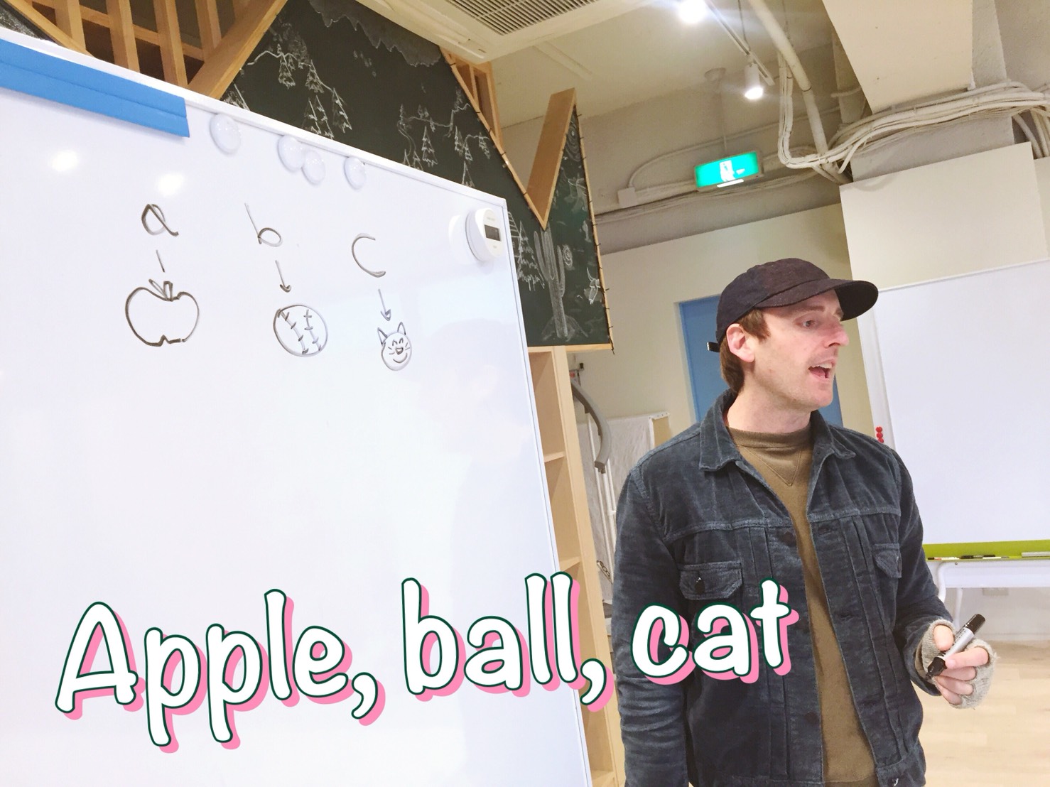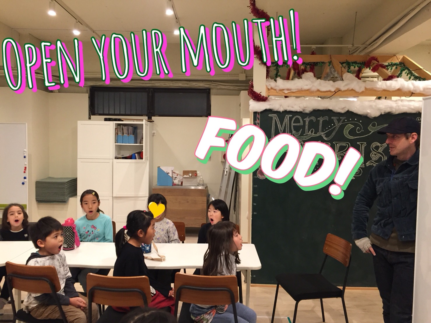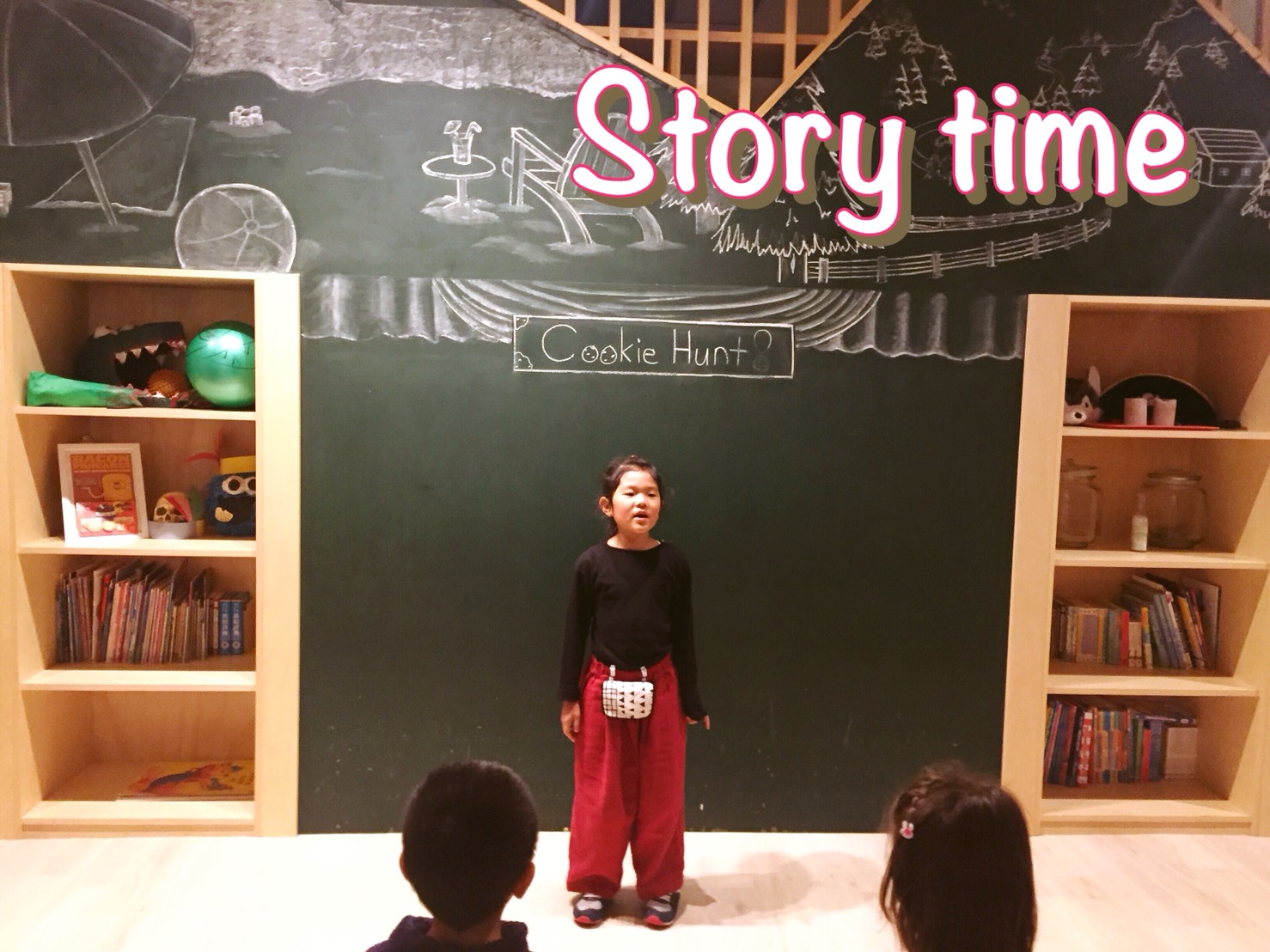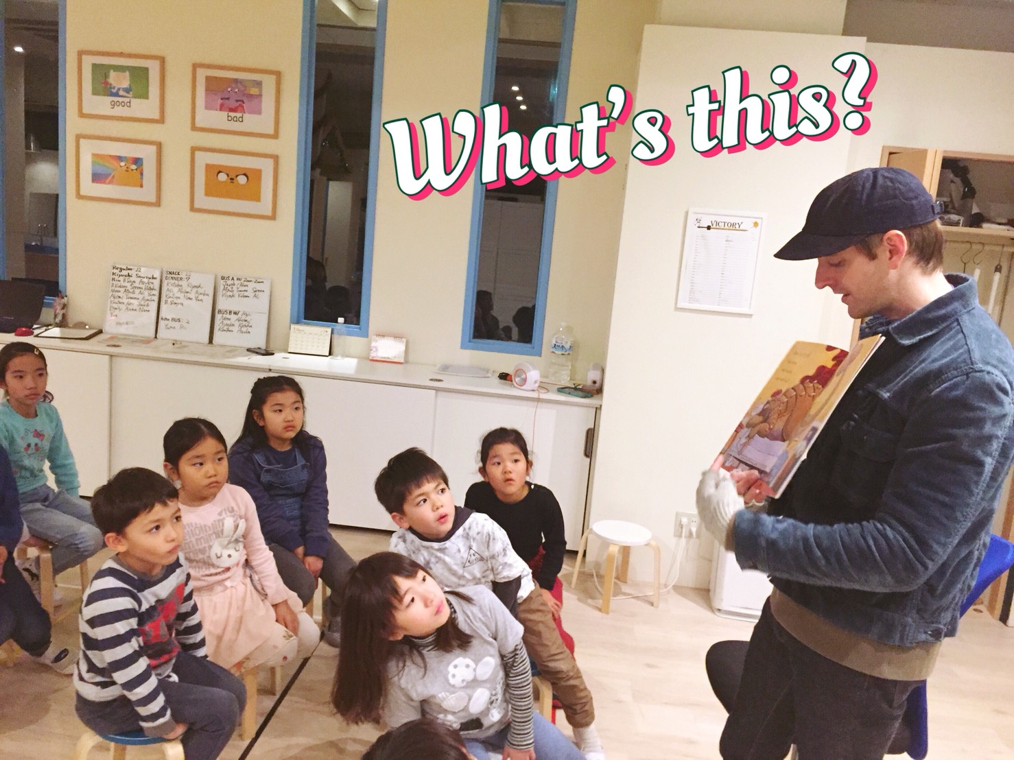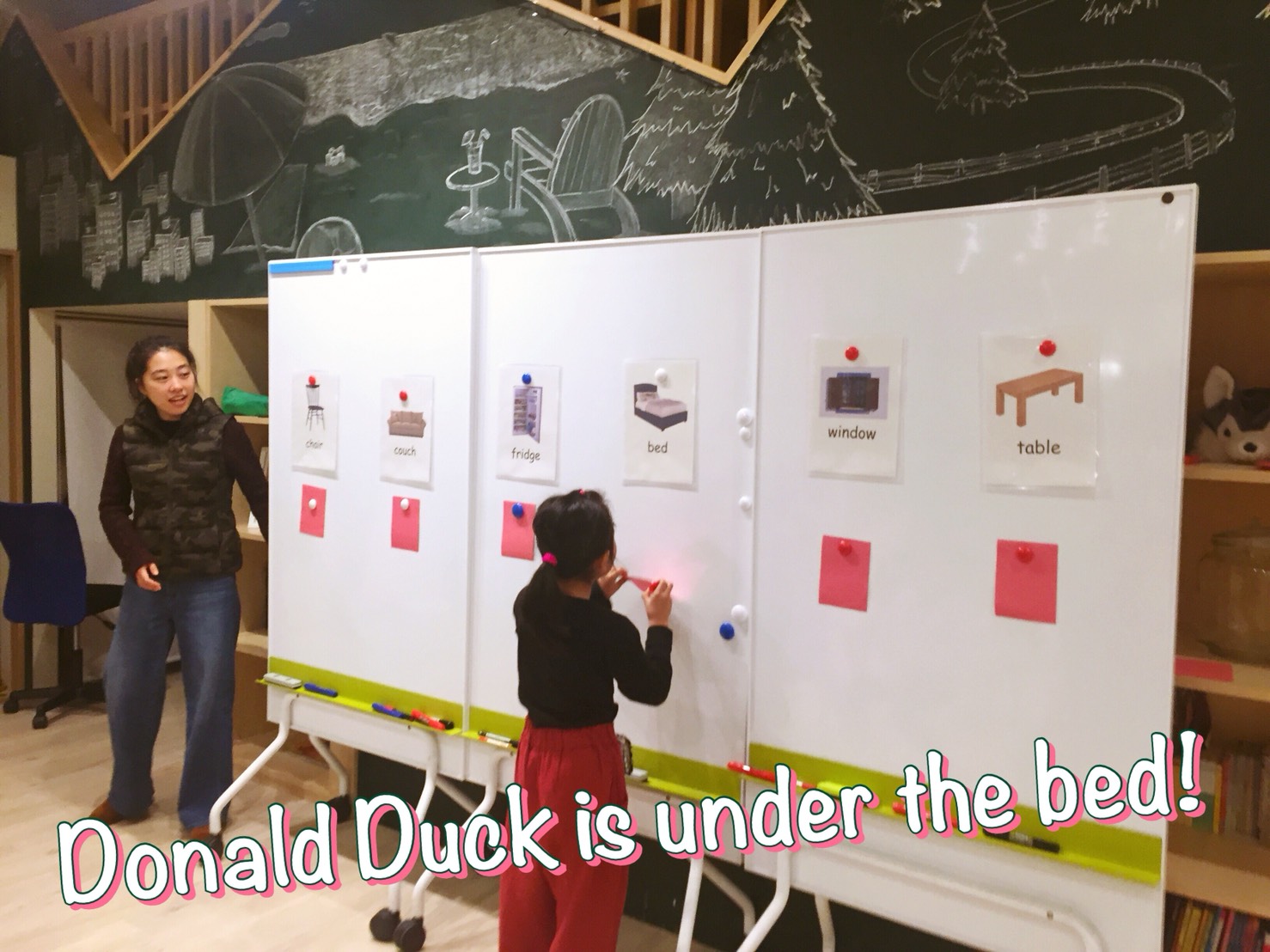 フォニックス、カードをつかって前置詞をつかったセンテンスの練習、おやつタイムでの質問とその受け答え、そして最後はストーリータイム。