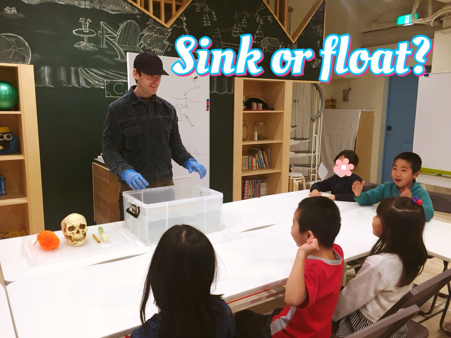 水を張った容器に、いろいろな物を入れて”Sink or float?”(沈む?浮く?)をやりました。