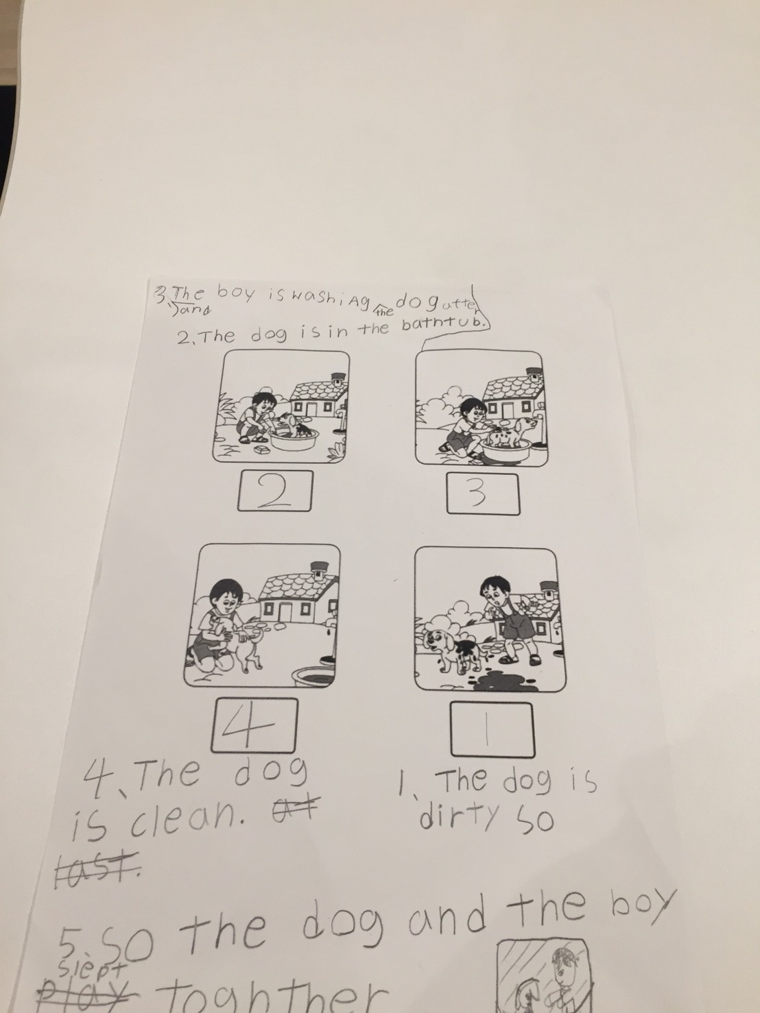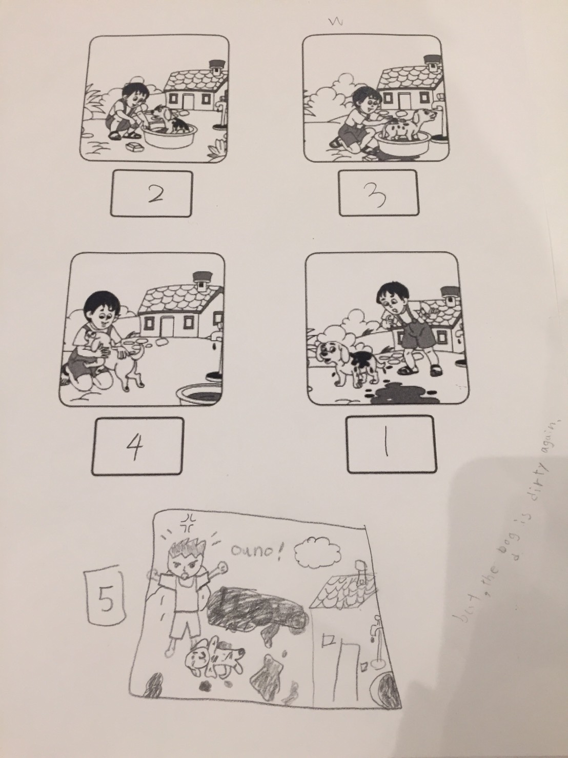 二人組のペアになると先生からある紙がわたされました。4つの絵を自由にならべて、ストーリーを作ってみるゲームです。