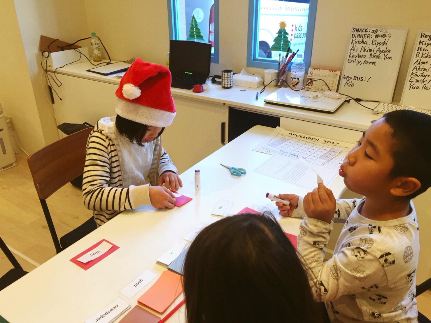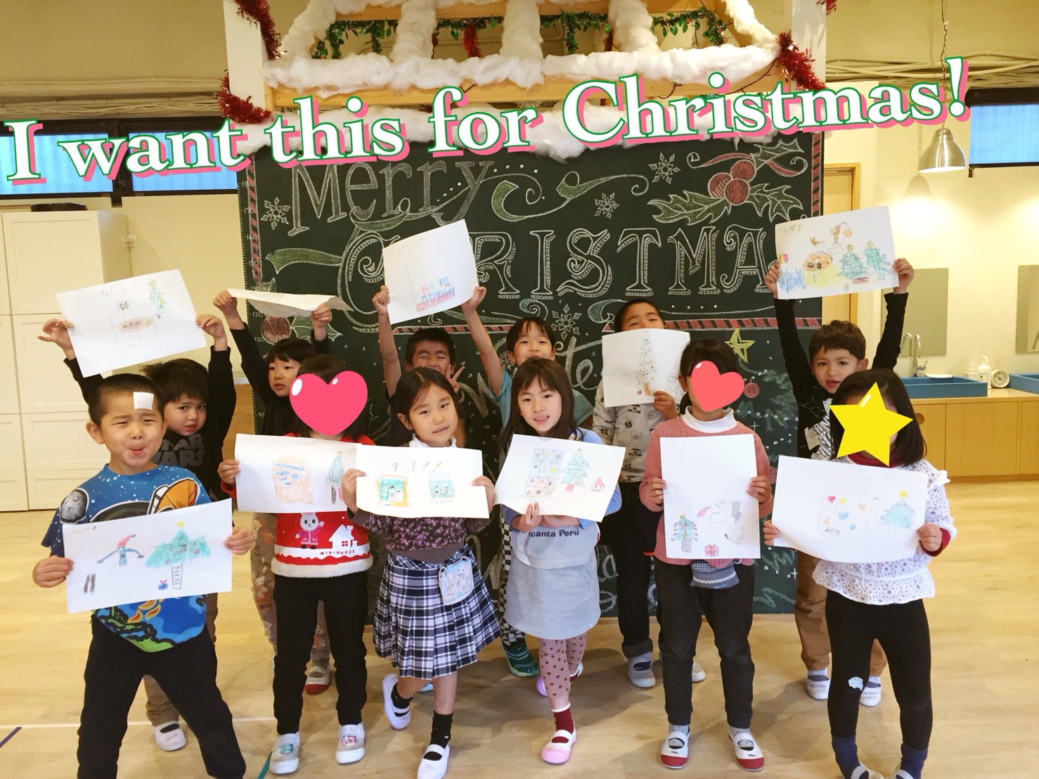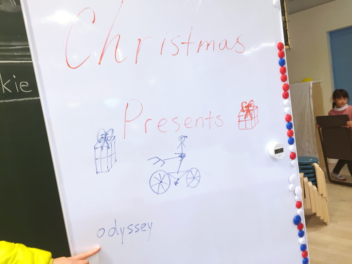 今日の”Workshop”(ワークショップ)の時間は”Arts and crafts”(工作)でクリスマスに欲しい物を描きました。先生:“What do you want for Christmas?”(クリスマスに何が欲しい?)