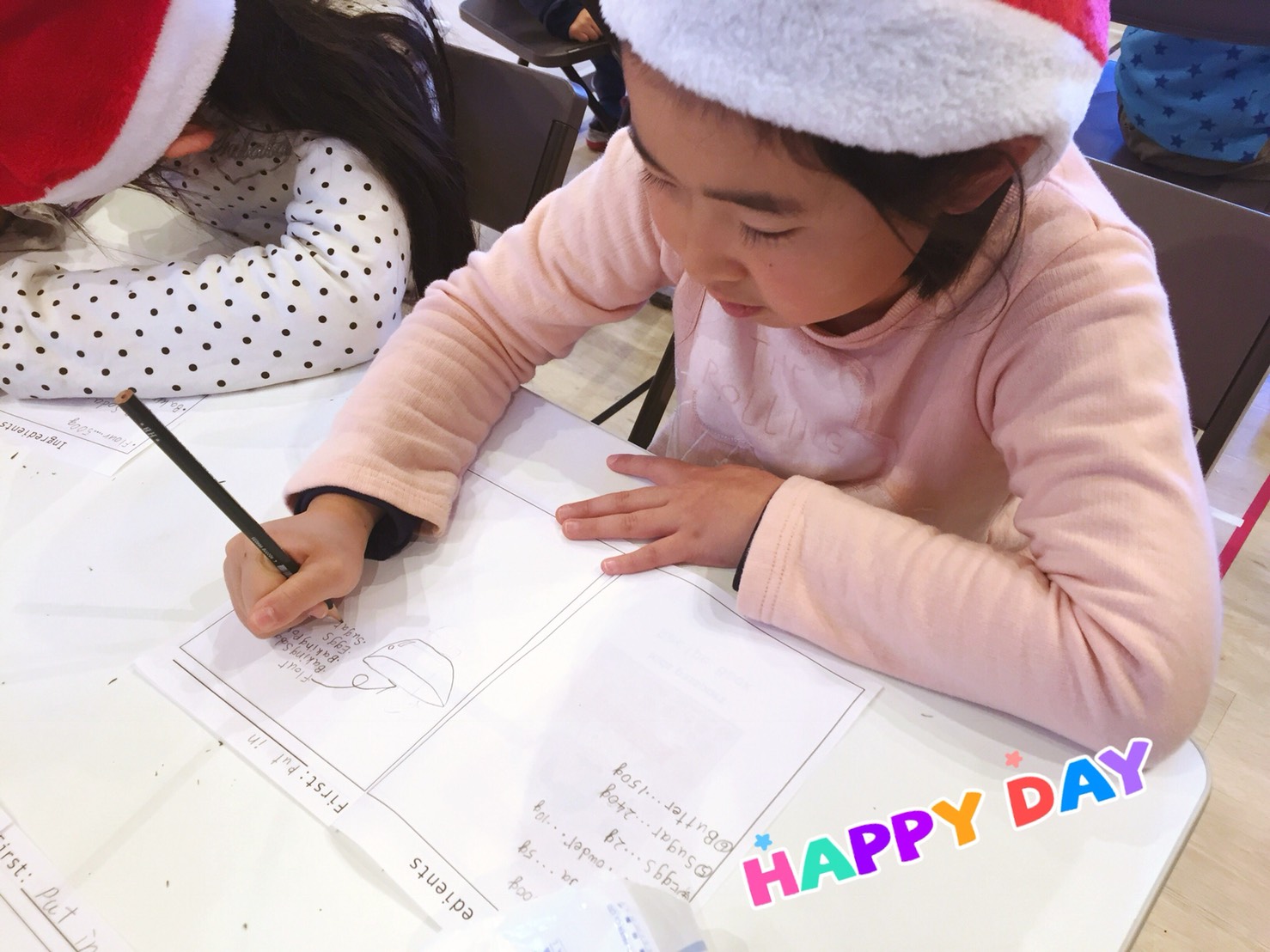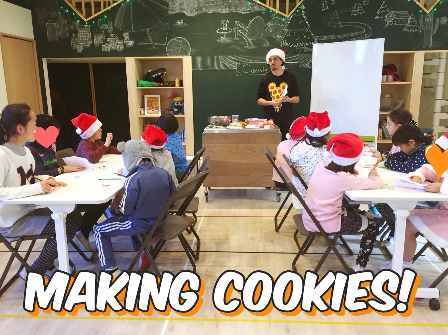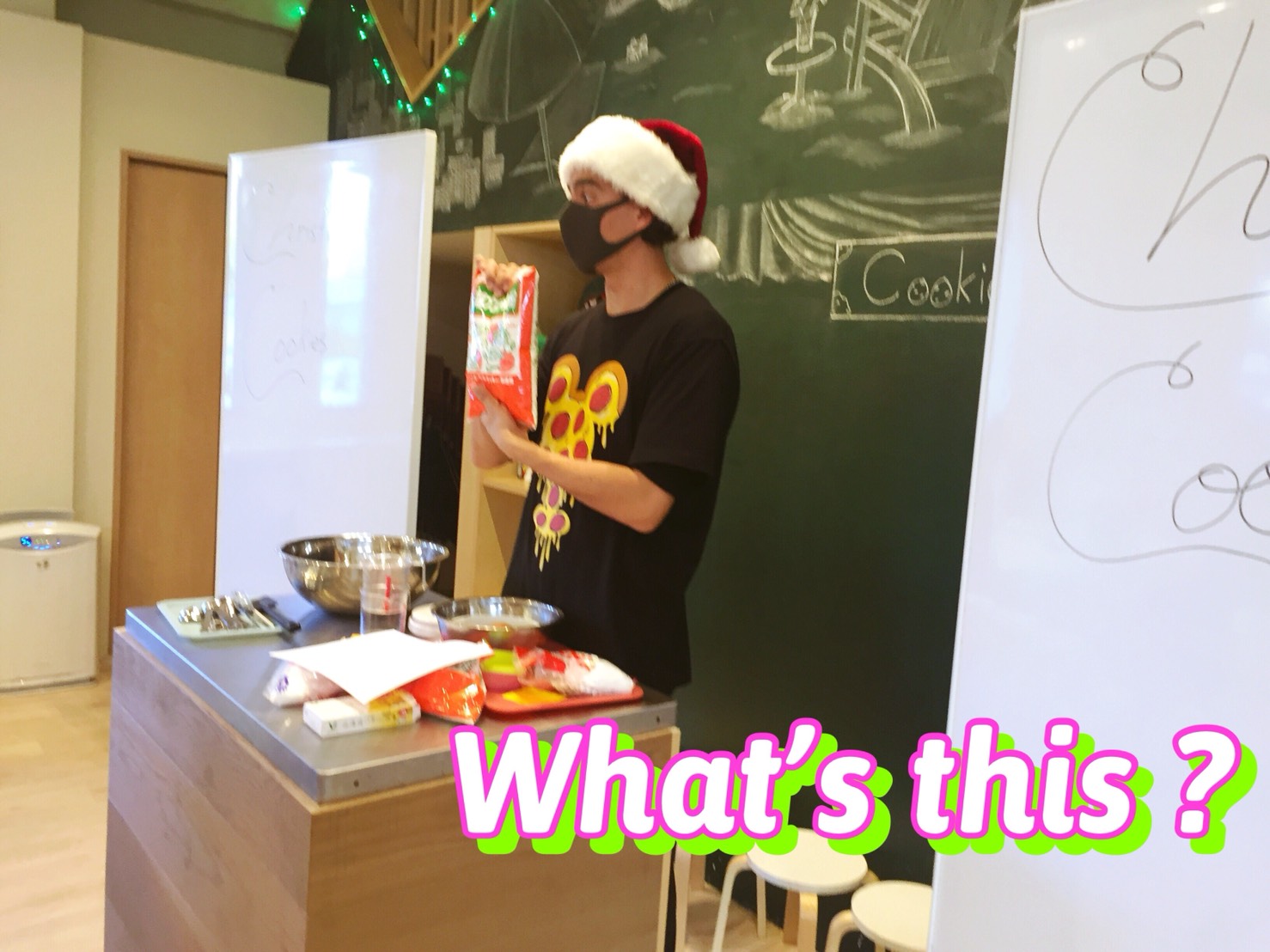 午前中のイベントは”Cooking”(クッキング)で”Christmas cookies”(クリスマスのクッキー)を作りました。先生:“What are the ingredients?”(材料はなに?)