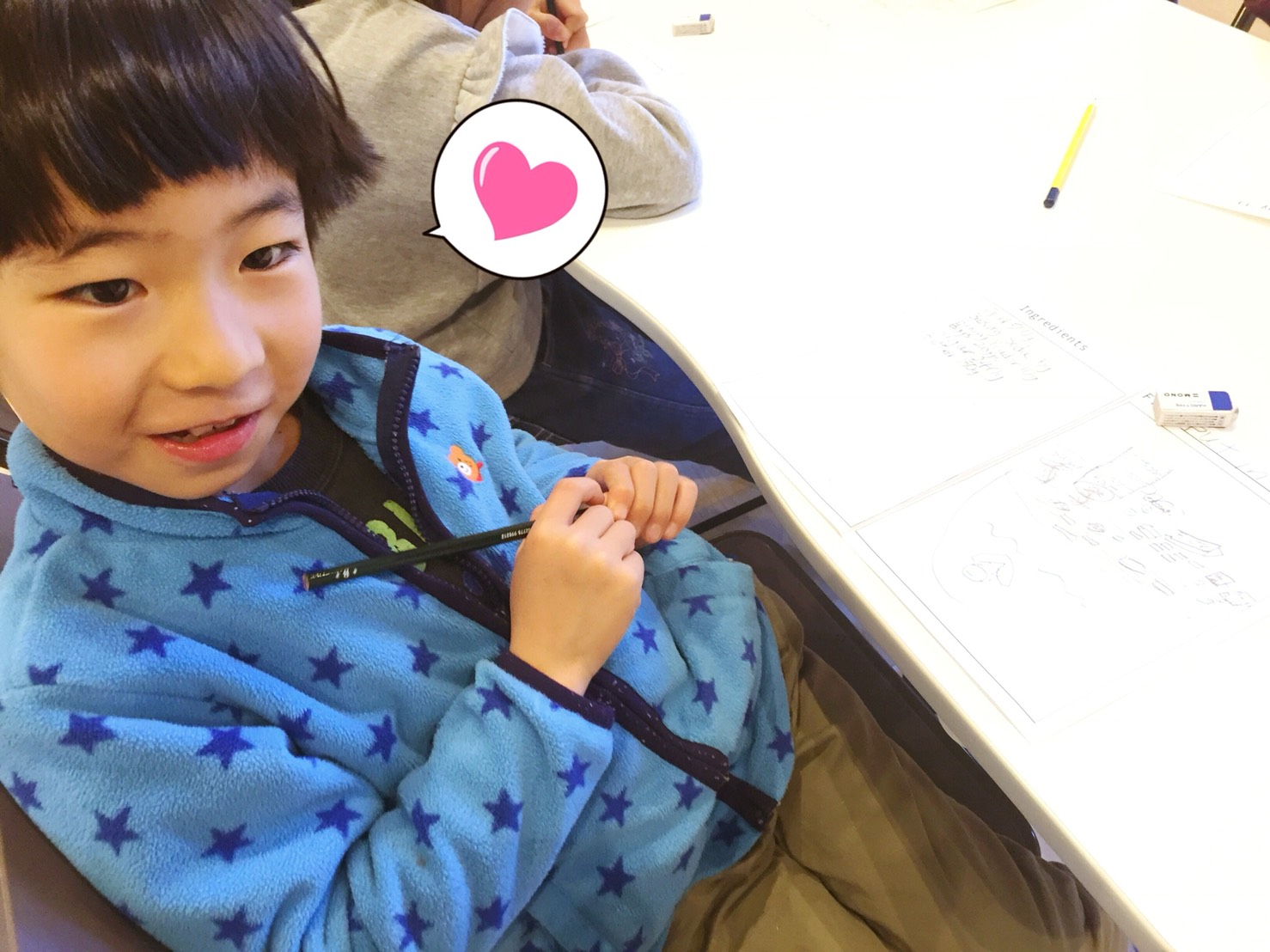 先生:”What are you drawing on your cookie?”(クッキーになにを描いてるの?)