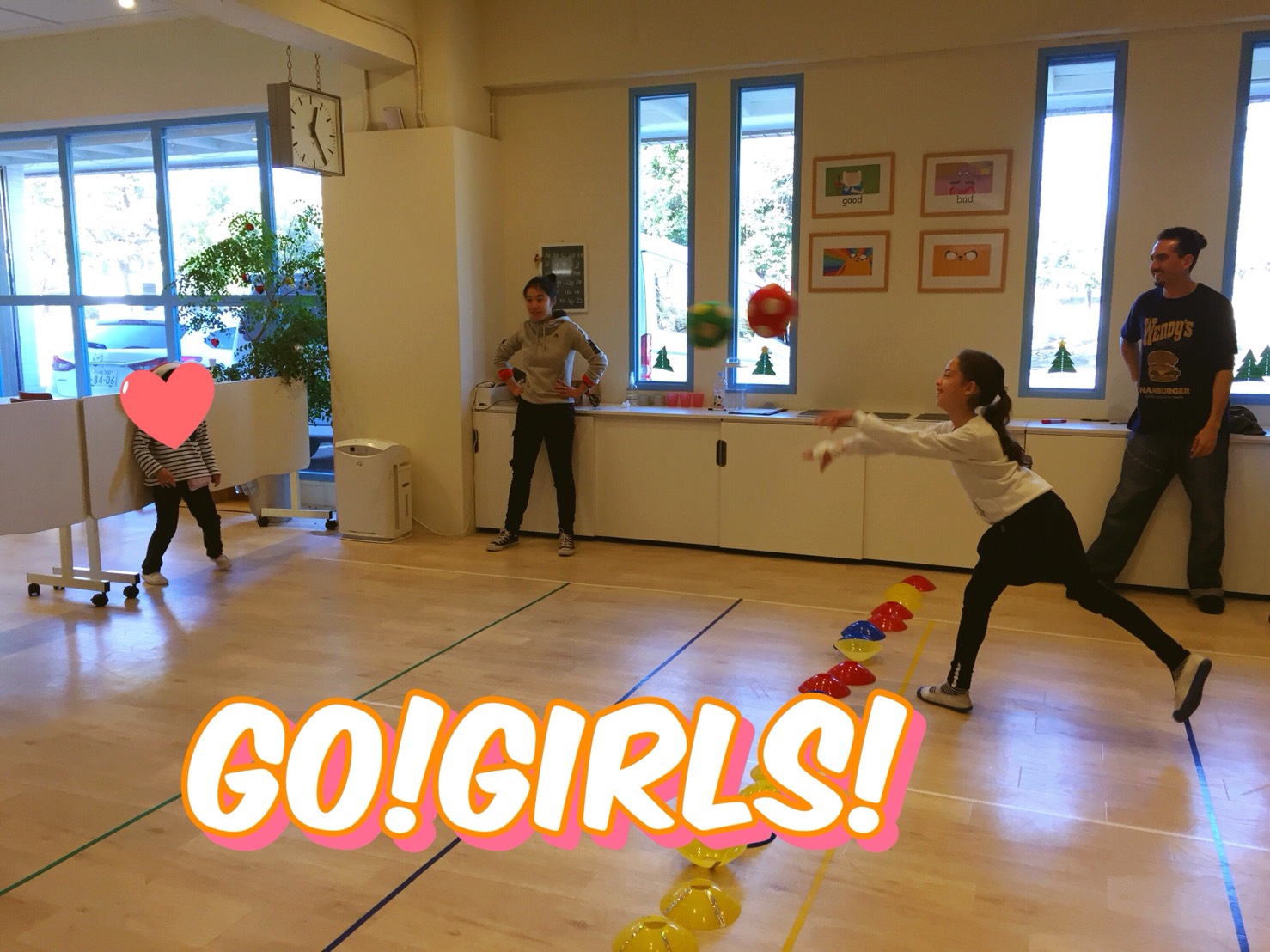 フワフワのクッションボールが思ったところに飛ばずに少し苦戦している子。
