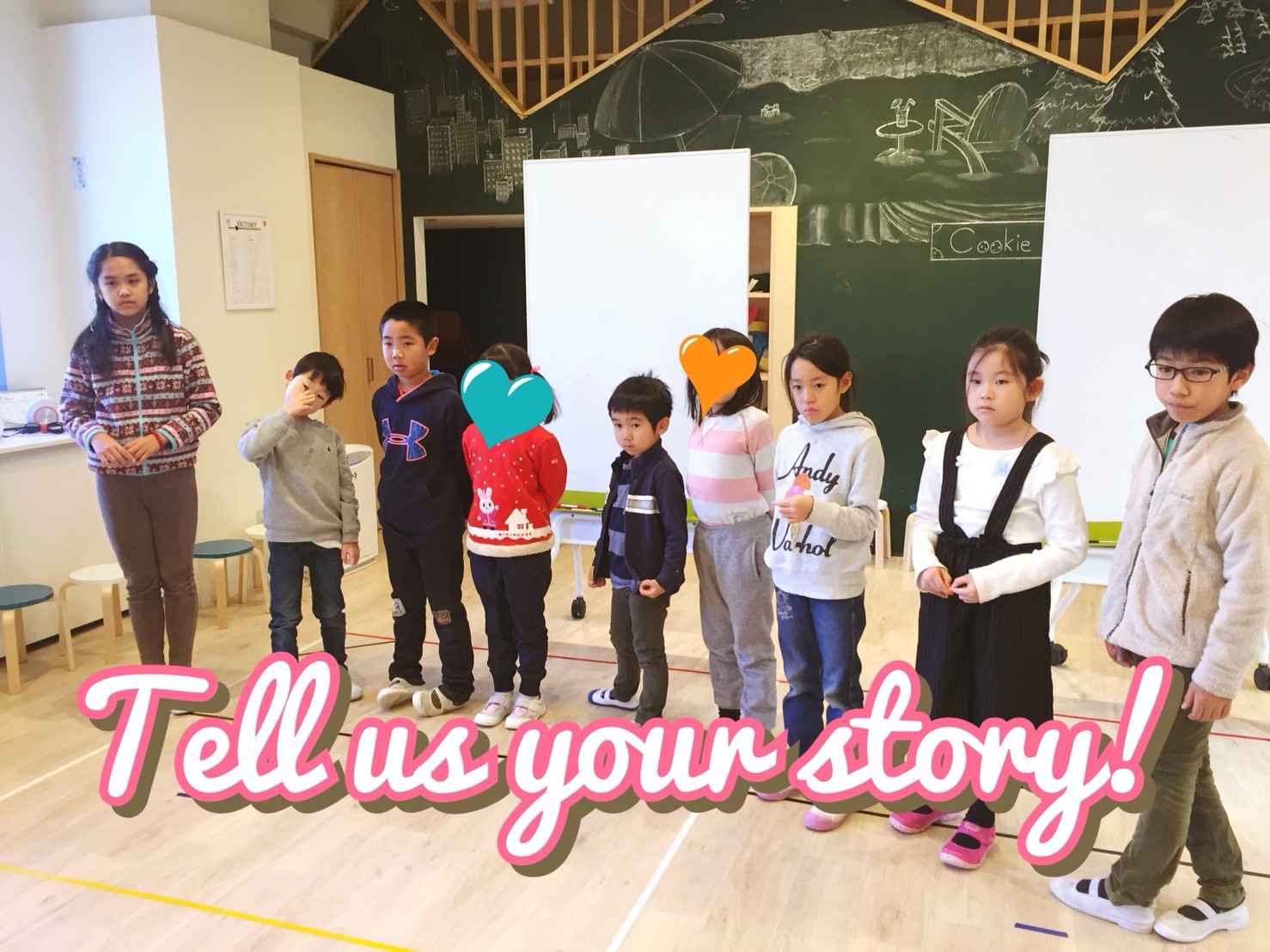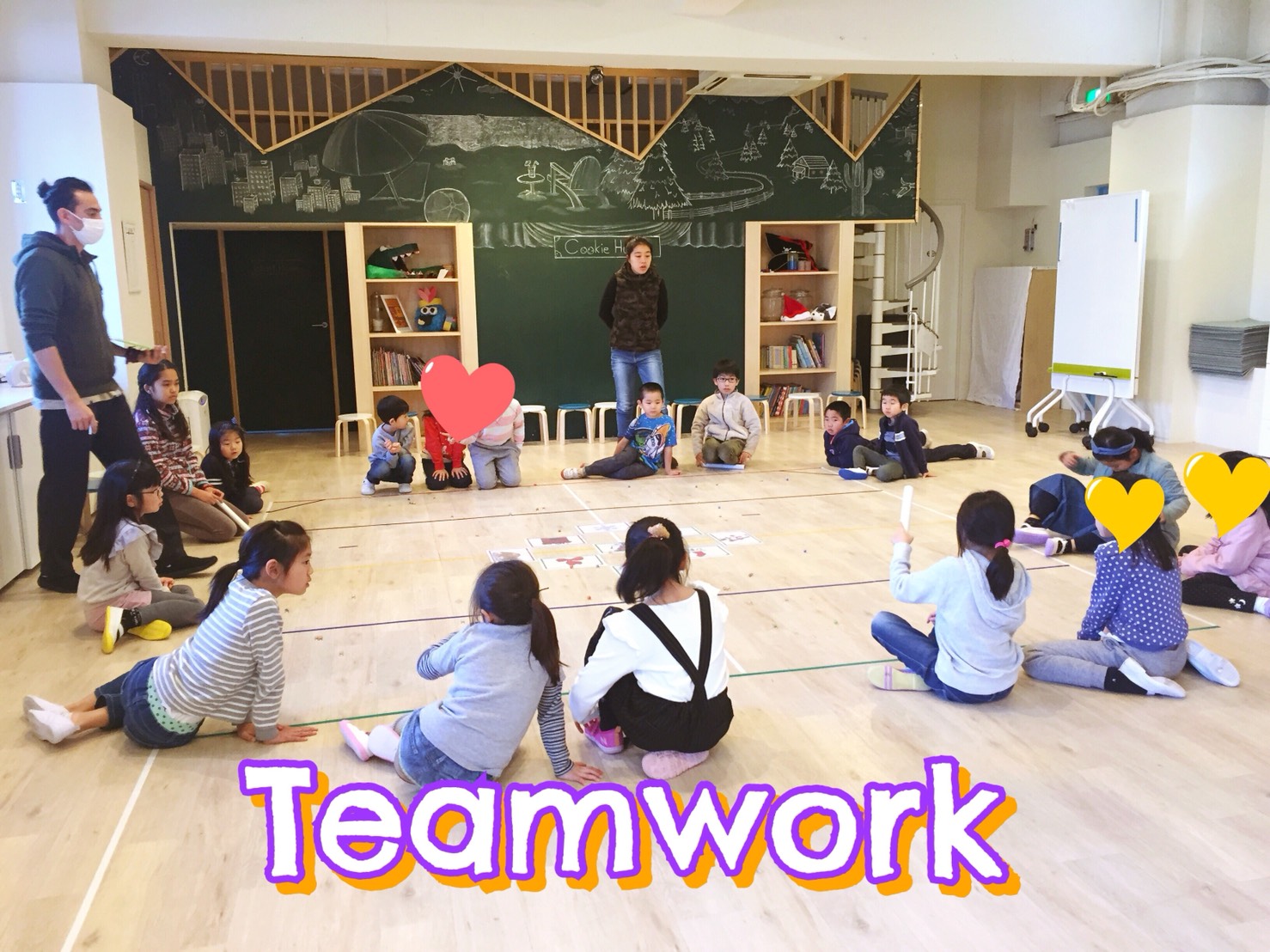 そのほかには、先生が出す指令を聞き取って、体や他のメンバーと一緒になって表現をするゲームやでてきた単語をつかってオリジナルストーリーをつくるレッスンを行いました。