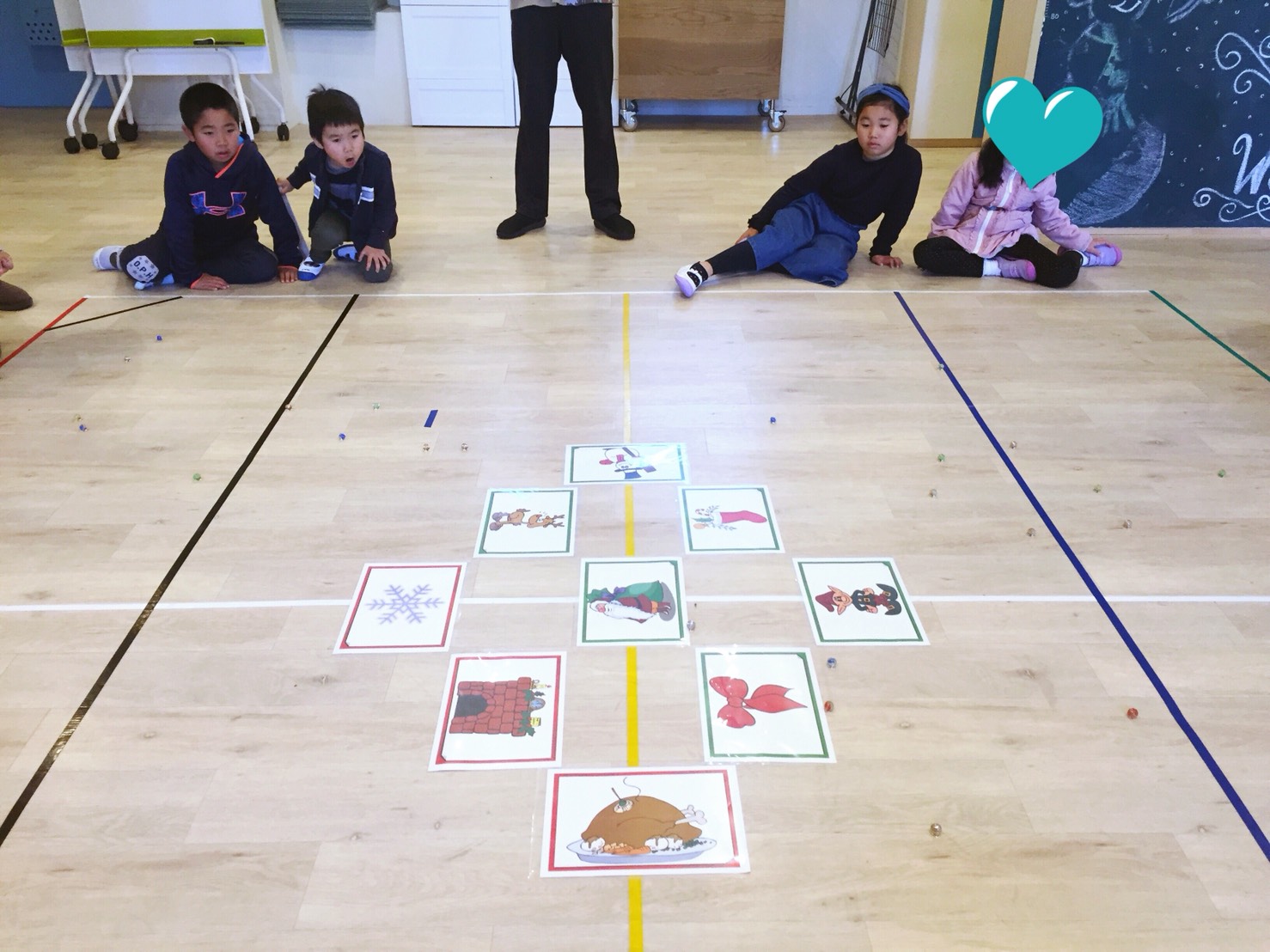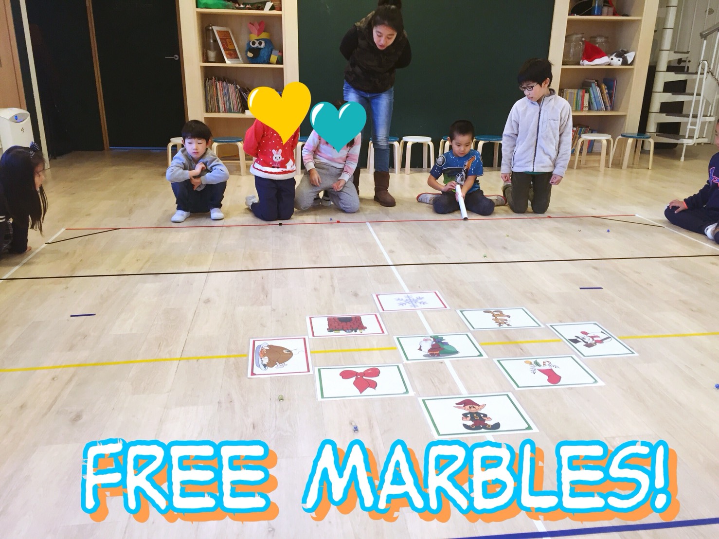 床に置いてある単語カードの上に手持ちのビー玉を乗せるゲームです。
