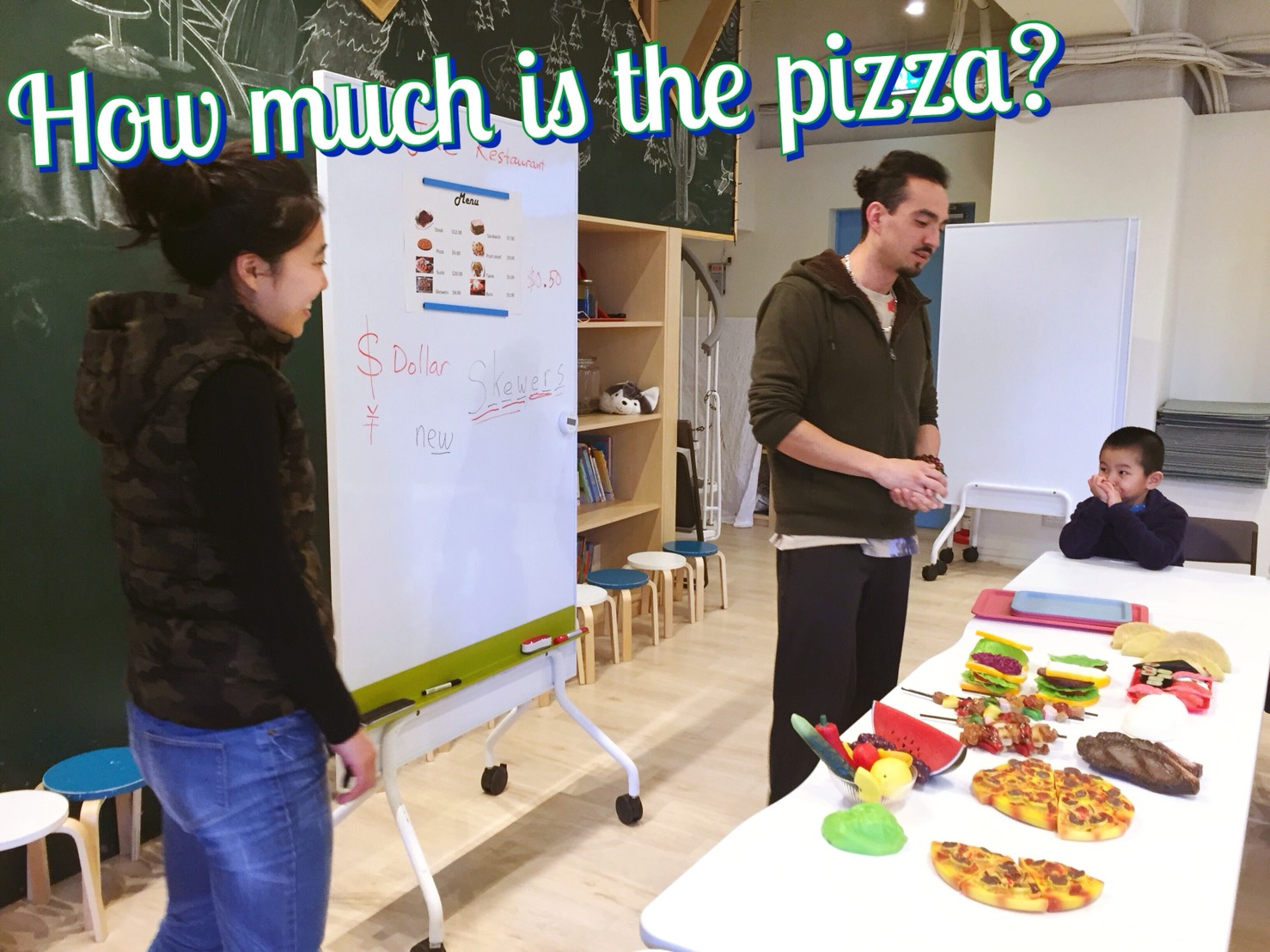 メニューや値段の確認。オーダーの仕方や金額の計算の仕方を教わったら、おもちゃのお金を手にオーダーをしてみよう。