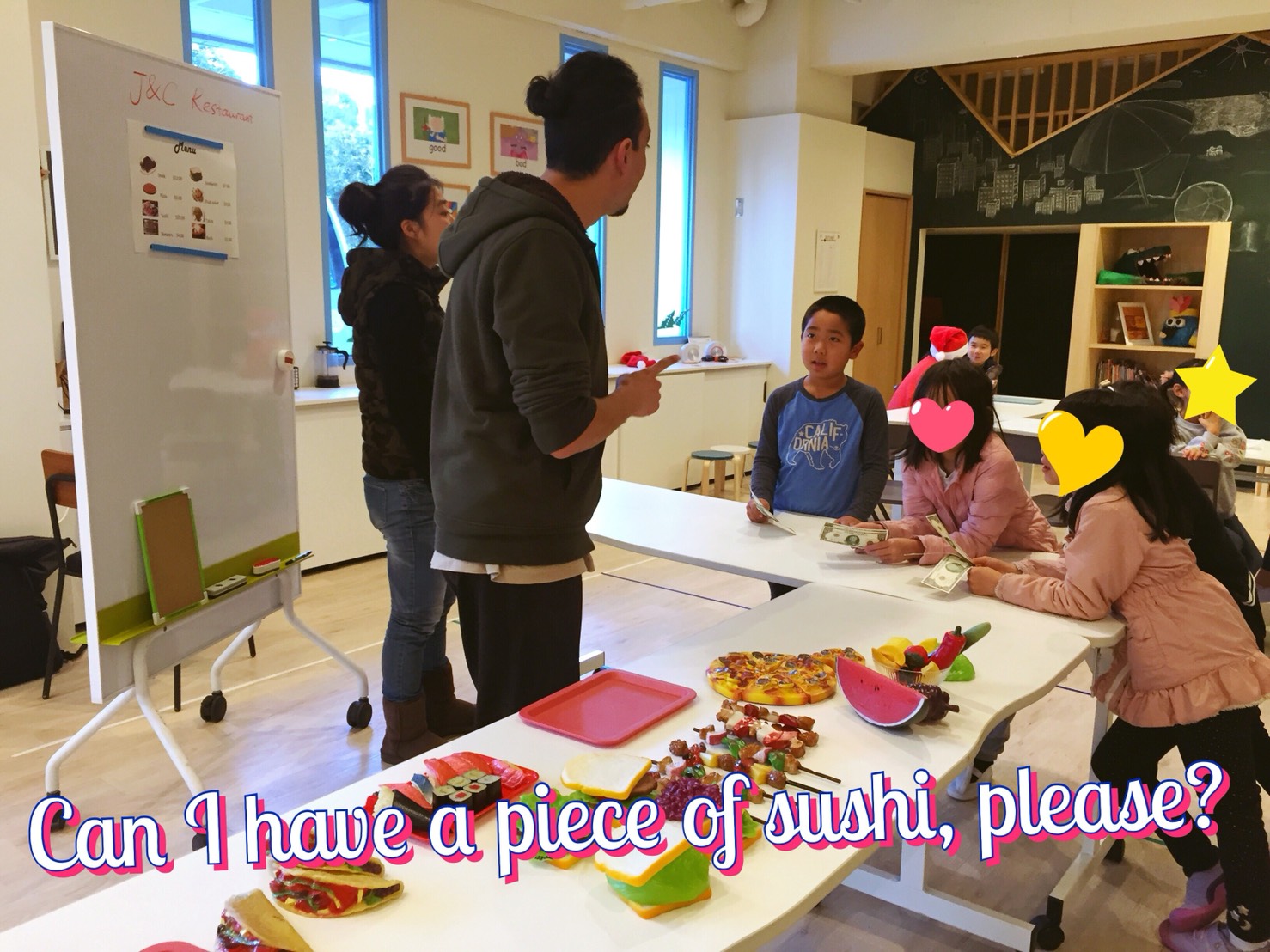 生徒さん:”Can I have sushi, please?”(寿司をください)