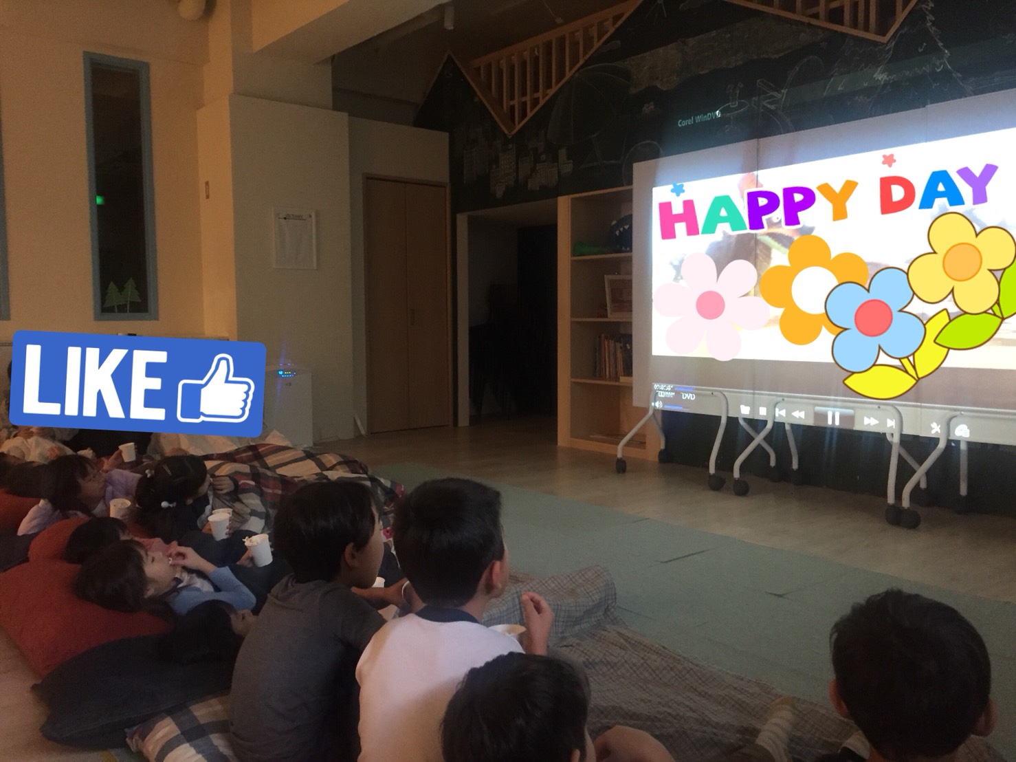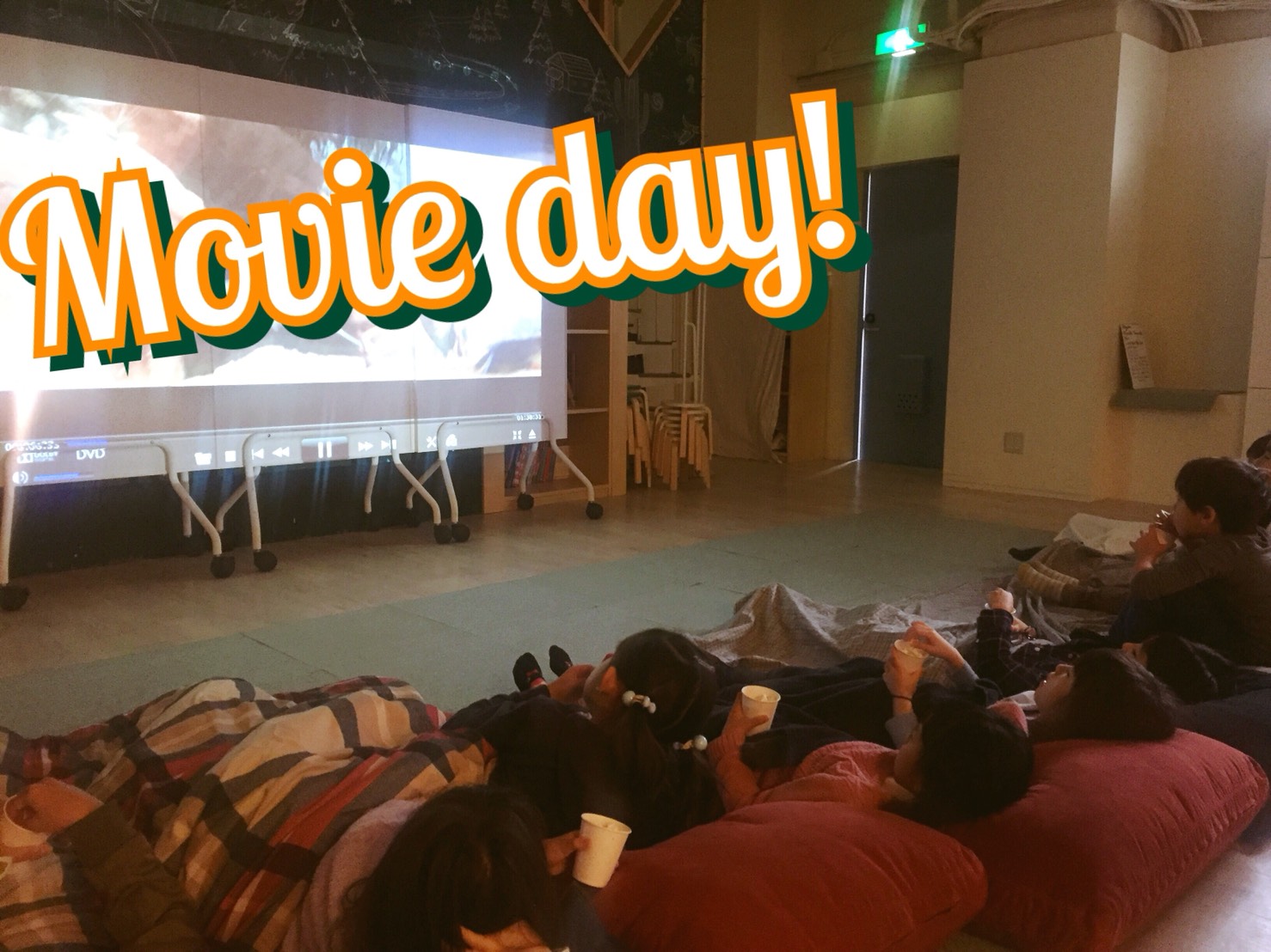 みんなで横になって大きな画面で映画を観ました。