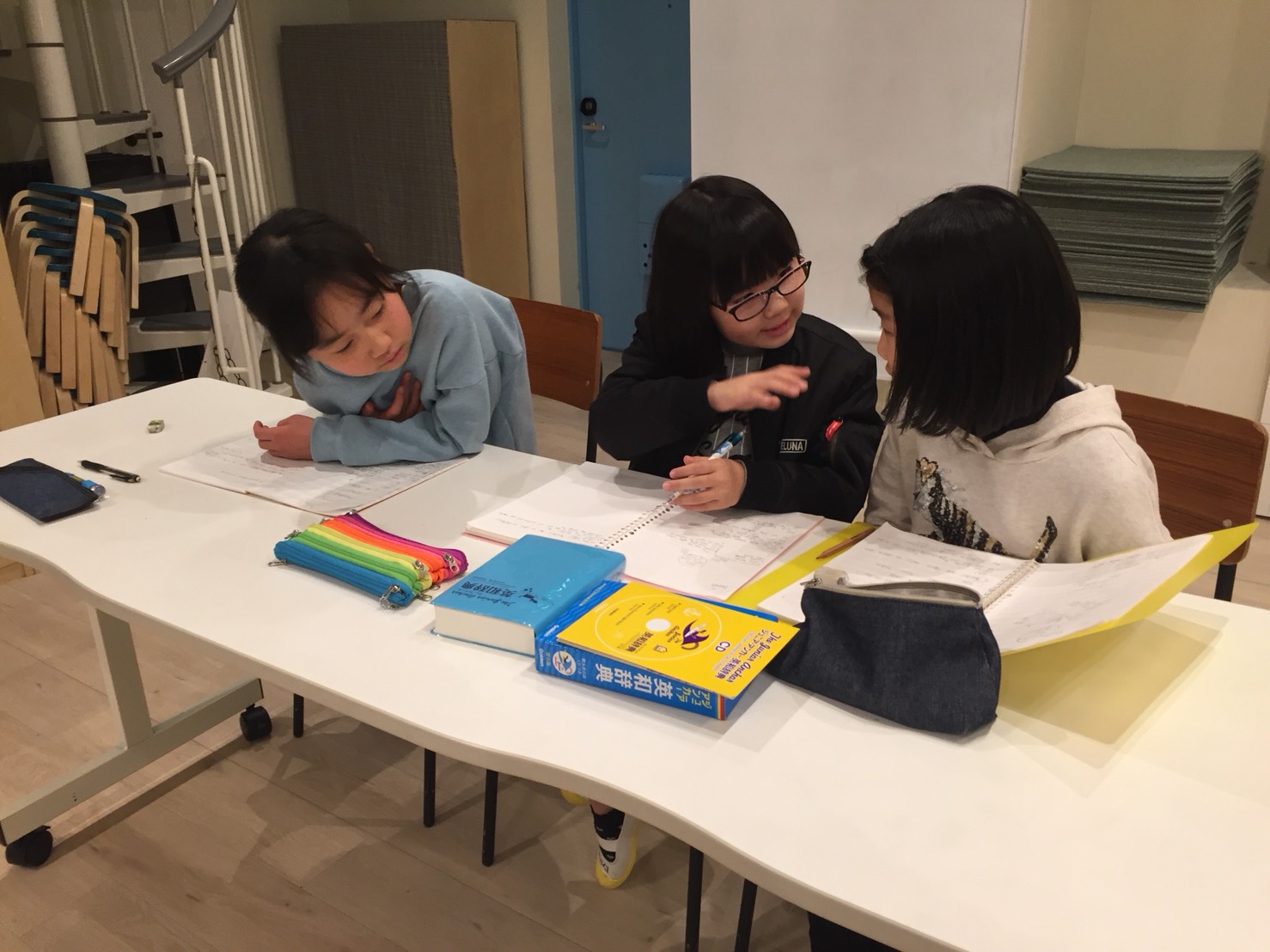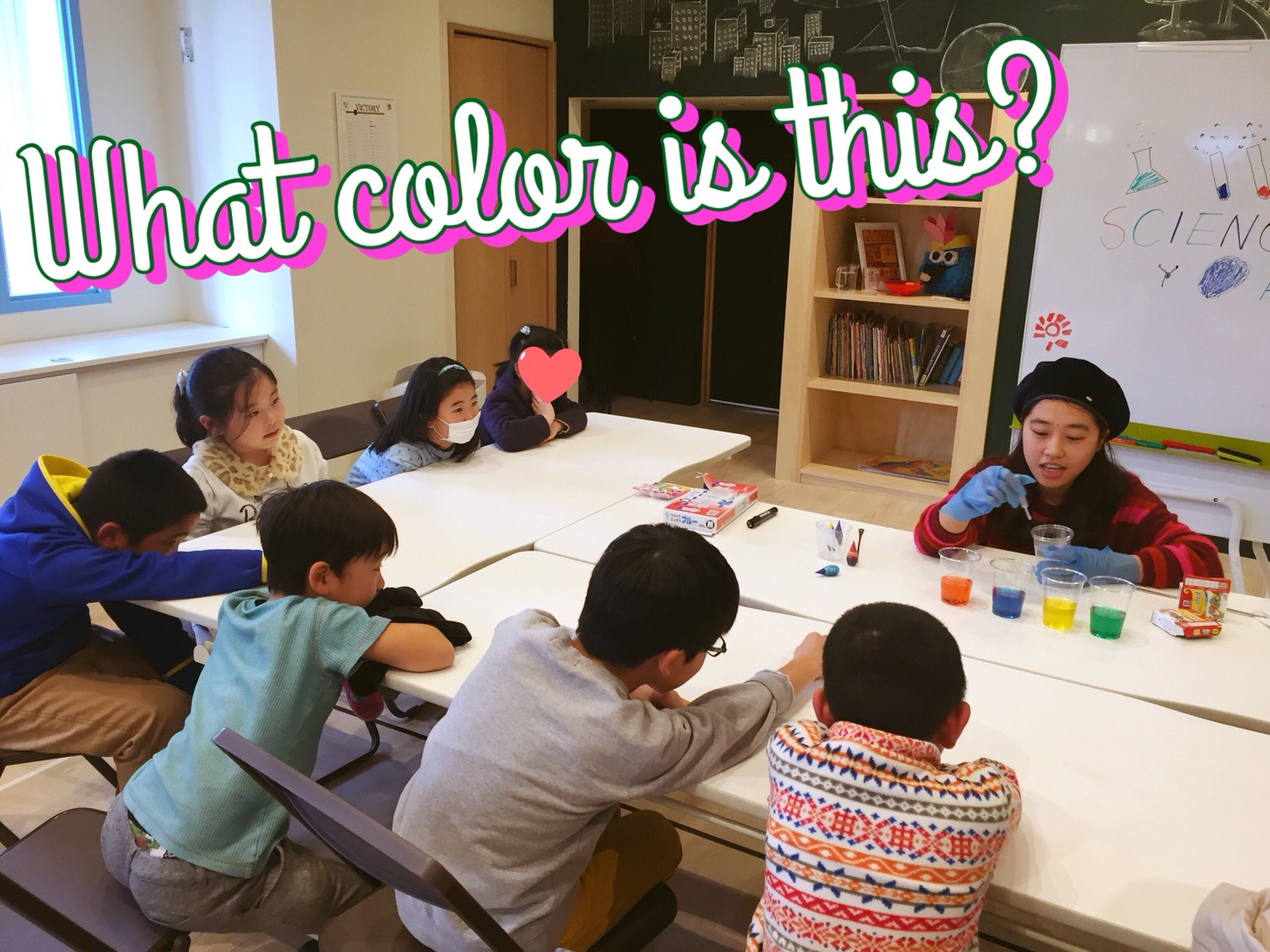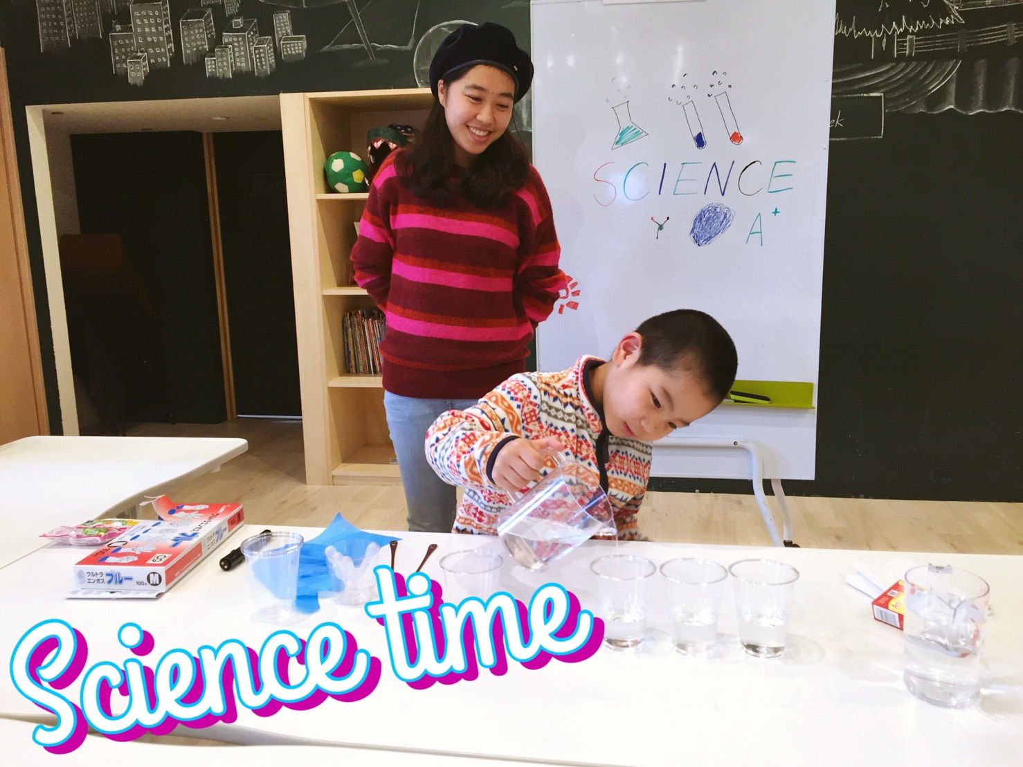 今日は早く来た生徒さんたちは、まずはワークショップを行いました。いろいろな色に分けられた水に、違う分量の塩を溶かします。何は浮かんで何は沈むか?