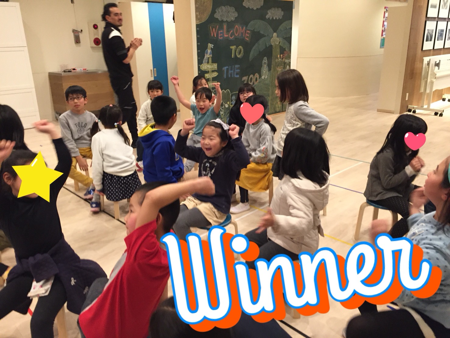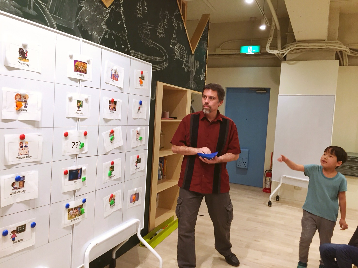 ホワイトボードに貼ってある単語を使た「センテンス」を答えられたら、そのカードをゲットできます!
