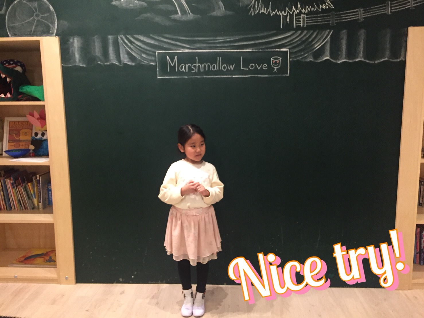 まずは最初の数センテンスを一緒に練習。One winter day, Marshmallow sees a beautiful girl.(ある冬の日、マシュマロはきれいな女の子に会います)