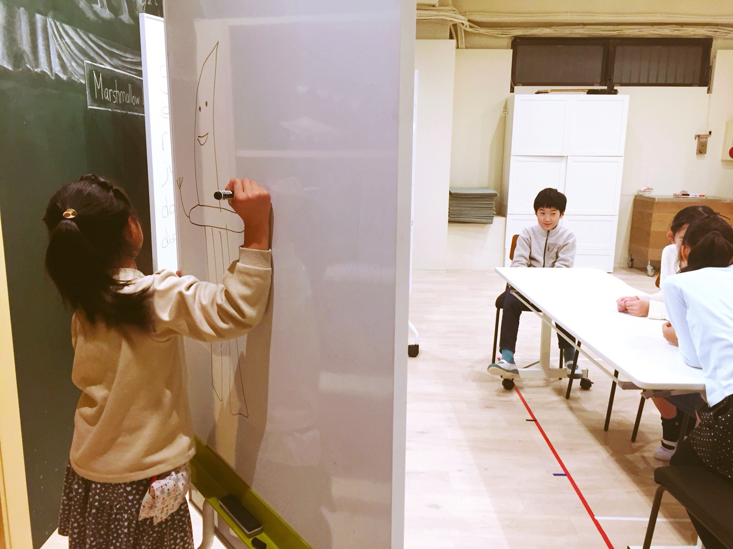 風邪やインフルエンザで休んでいた生徒さんもみんな揃ったナイトコースももりあがりました。生徒さんが書いた絵をみながら、それをセンテンスで答えていき、見事文法的にも正しいセンテンスで答えられたらマシュマロゲットです!