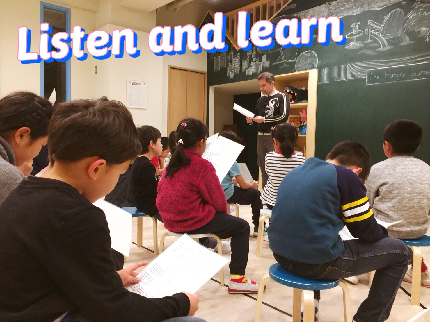 先生が読み聞かせてくれて、自分たちでも練習をして、みんなの前での発表も少しずつ上達しています。