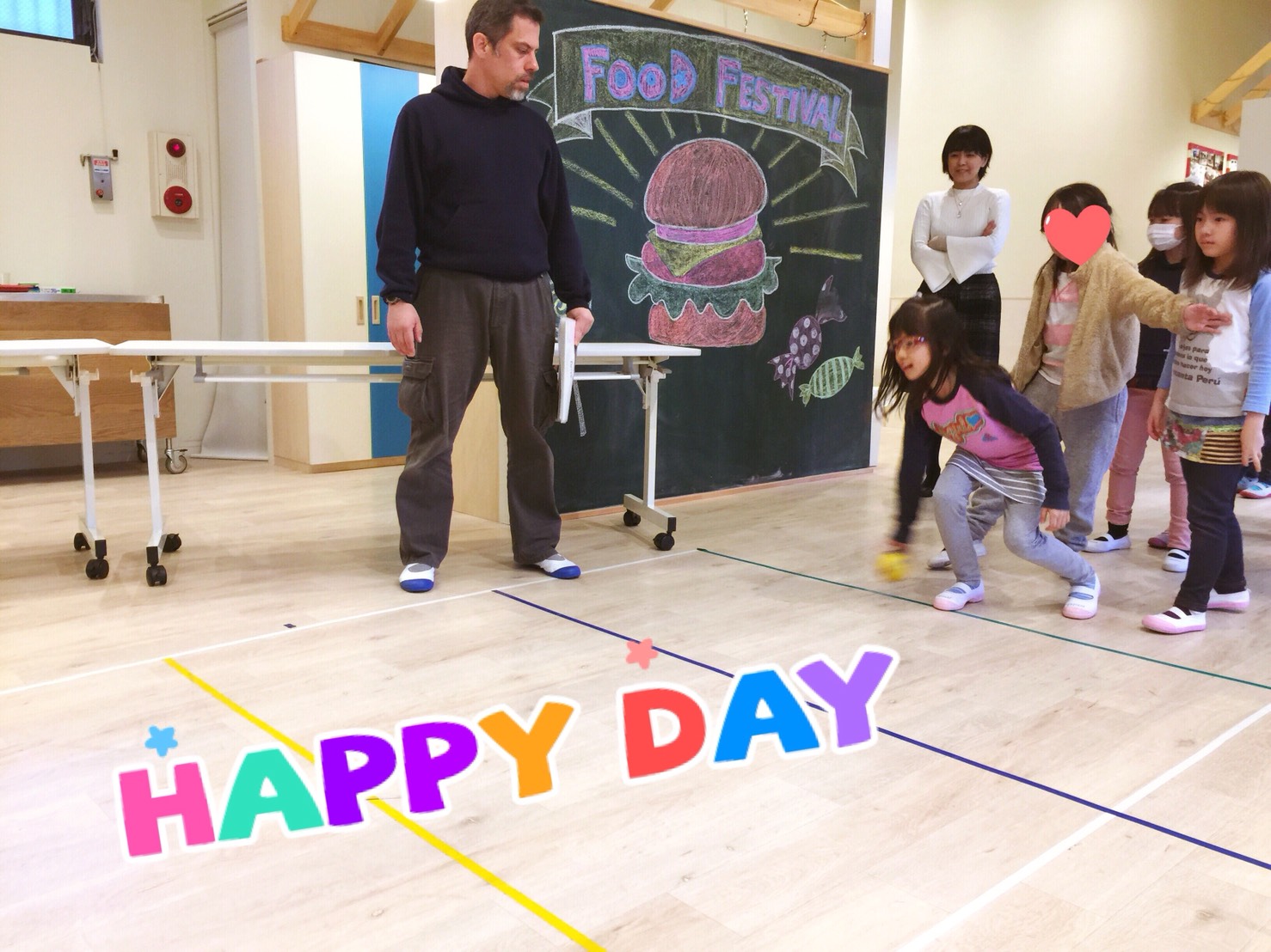先生:”OK!! Nice throw!! What’s the word?”(オーケー!!上手に転がしたね!!単語は何かな?)