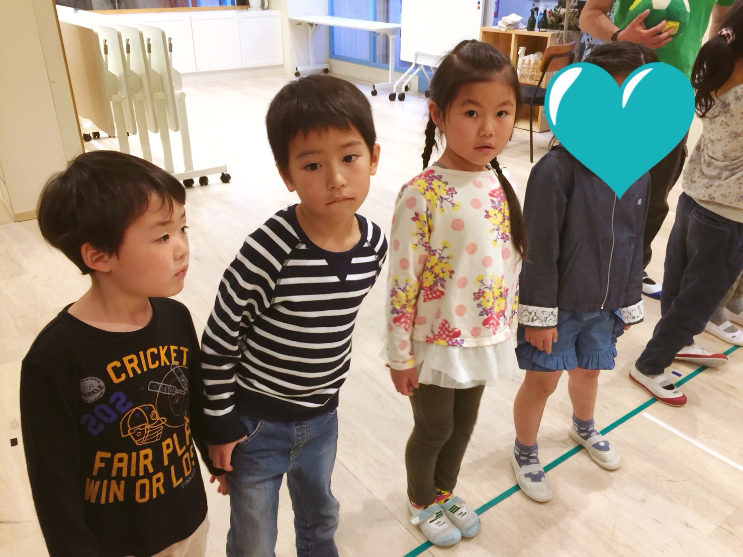 4月からキッズパスポートに通い始めた新1年生さんたちはまだまだ緊張をしている様子。“Hello. How are you?”(ハロー。調子はどう?)