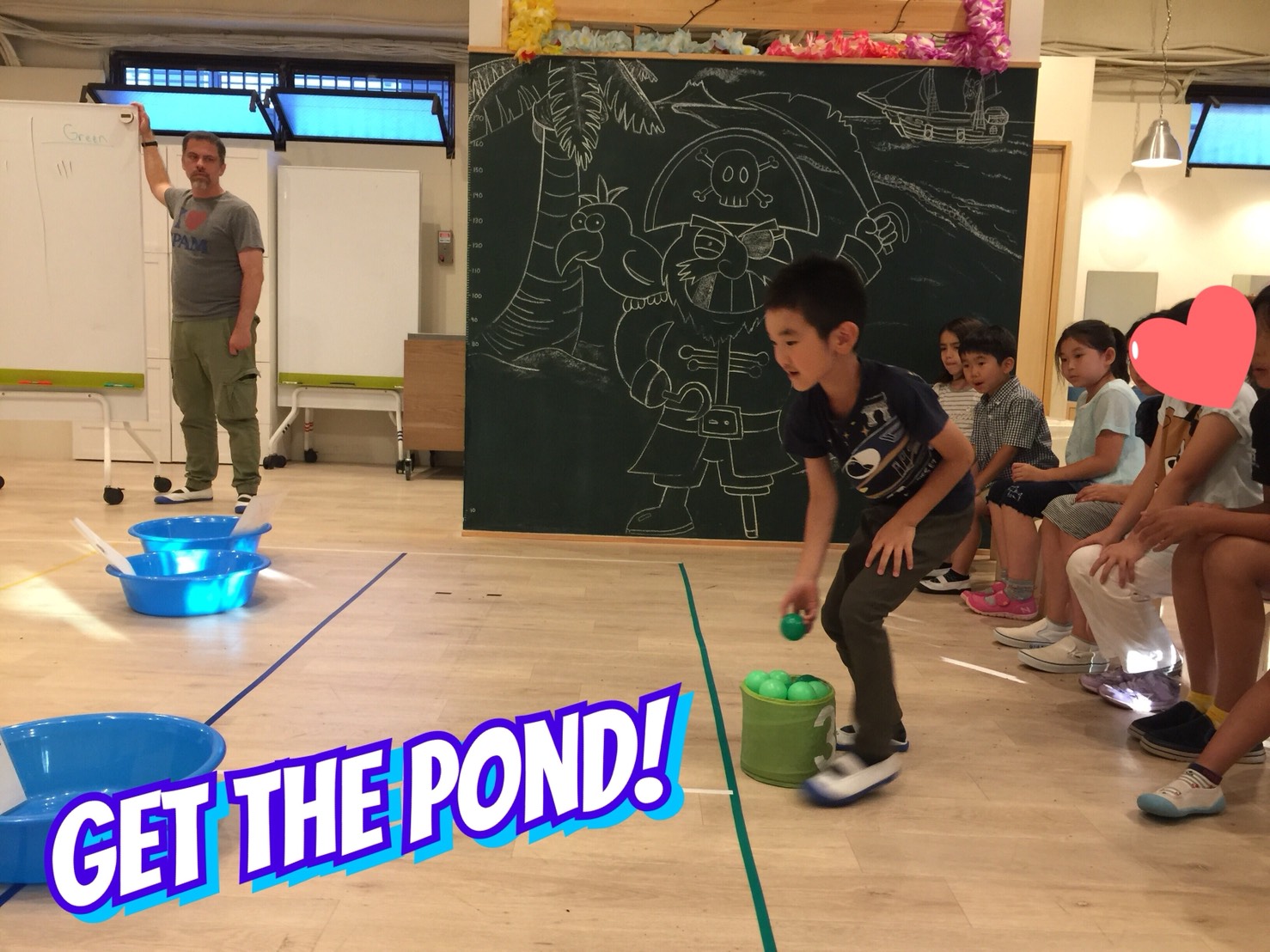スピーチコンテストのお題にもなっている「The Wide Pond」にでてくる単語を使いゲーム形式で学んでいきました。今日は体験生も来て一緒に英語ゲームを行いました。Flog,Scorpion,Pond,Tail,Bridge,Lightning bolt…