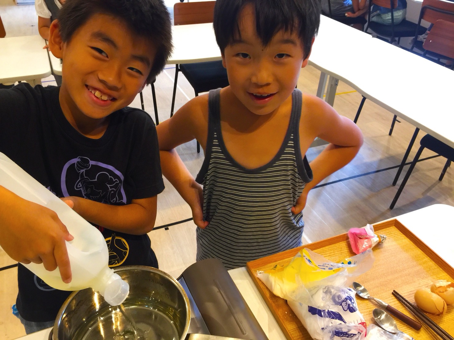 先生:”Okay. Let’s put one cup of flour into the bowl. Who wants to do it?”(オーケー。小麦粉を1カップ、ボウルに入れようか。やりたい人?)