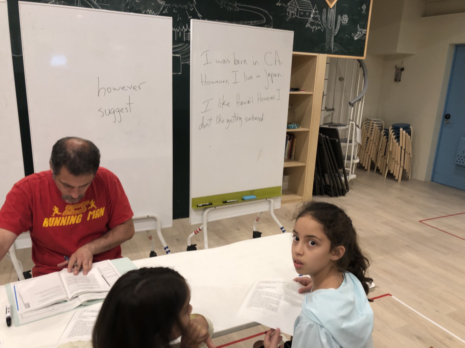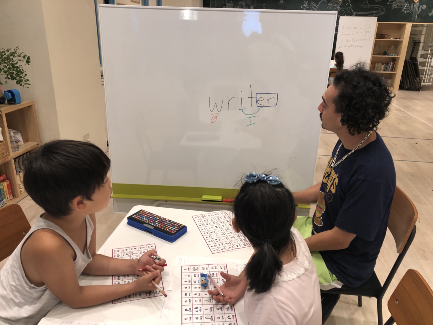 もう1グループは、ライティング。二人ともすっごく喋れるけど、次はそれを同じように英語で書けるようにする練習をしました!