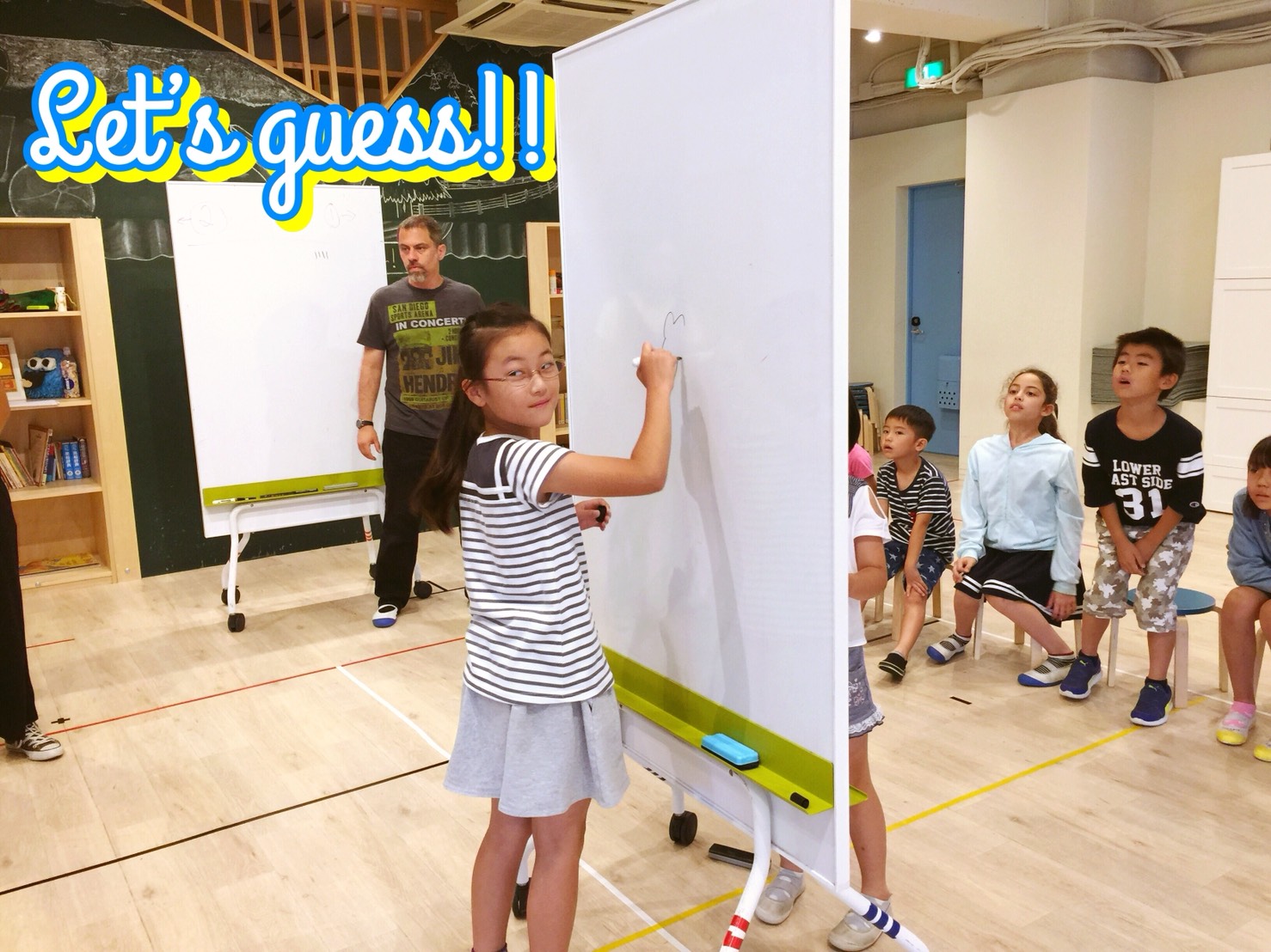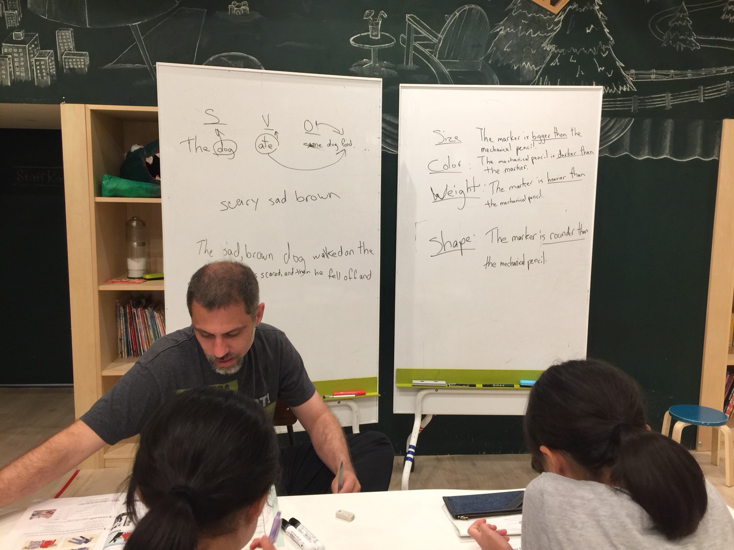 ベテラン生徒さん達はShapes, colors, size(形、色、サイズ)などの形容詞を付けくわえてセンテンスを作りました。