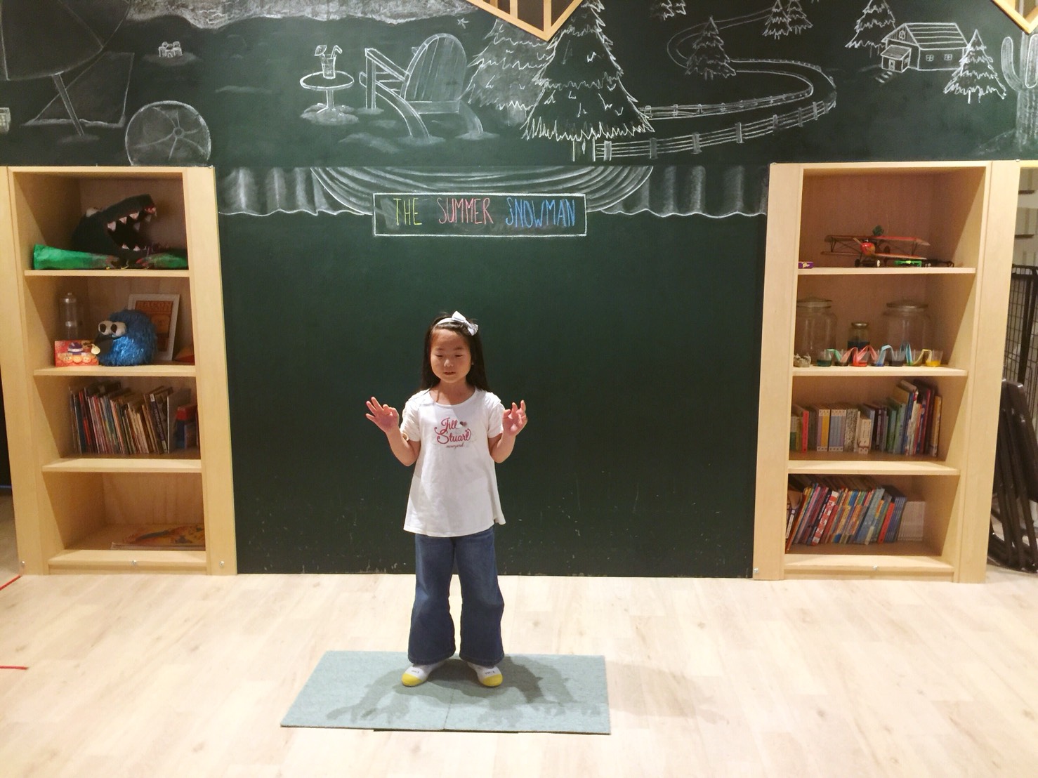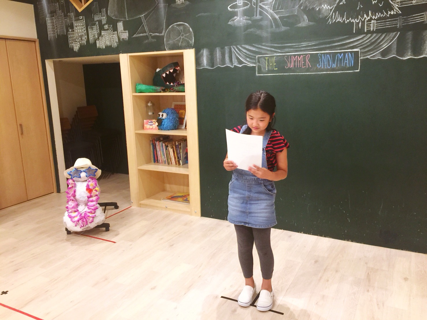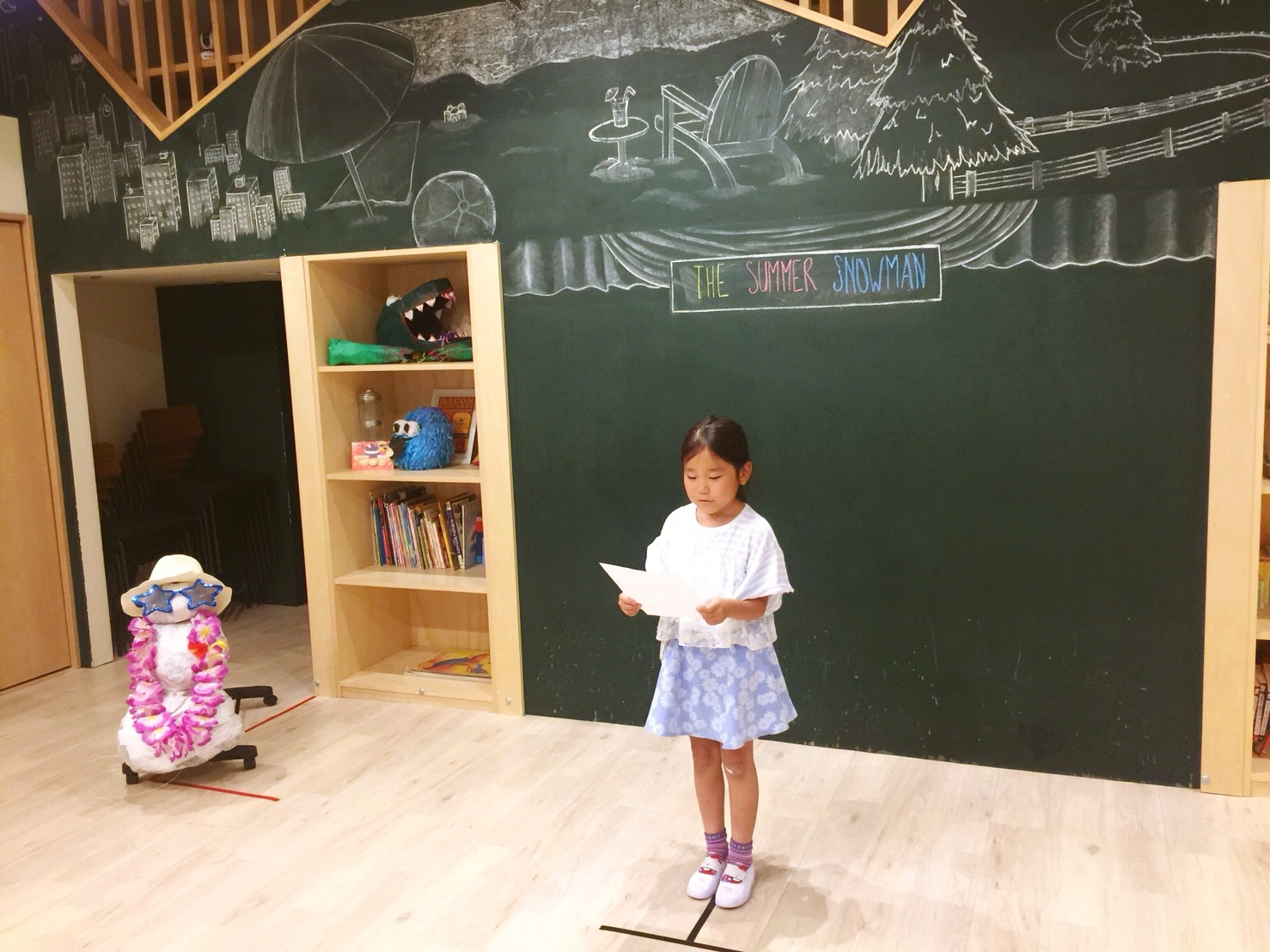 新しいストーリー”The Summer Snowman”(夏の雪だるま)を、全員にまんべんなく、みんなの前に出て披露してもらう新しい取り組みです。Do you know the summer snowman?(夏の雪だるまを知っていますか?)