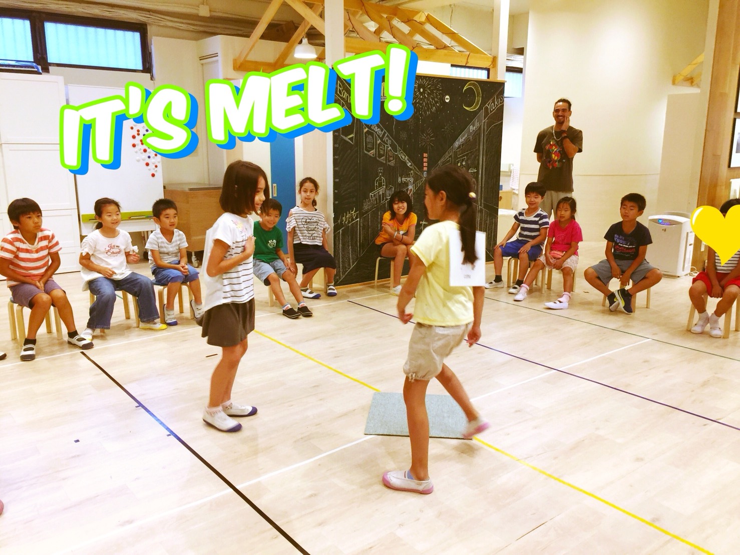 1人は円の真ん中に立っている状態で、その他のみんなはスツールを円状に並べて座ります。円の真ん中に立っている1人がお題を決めて大きな声で言います。