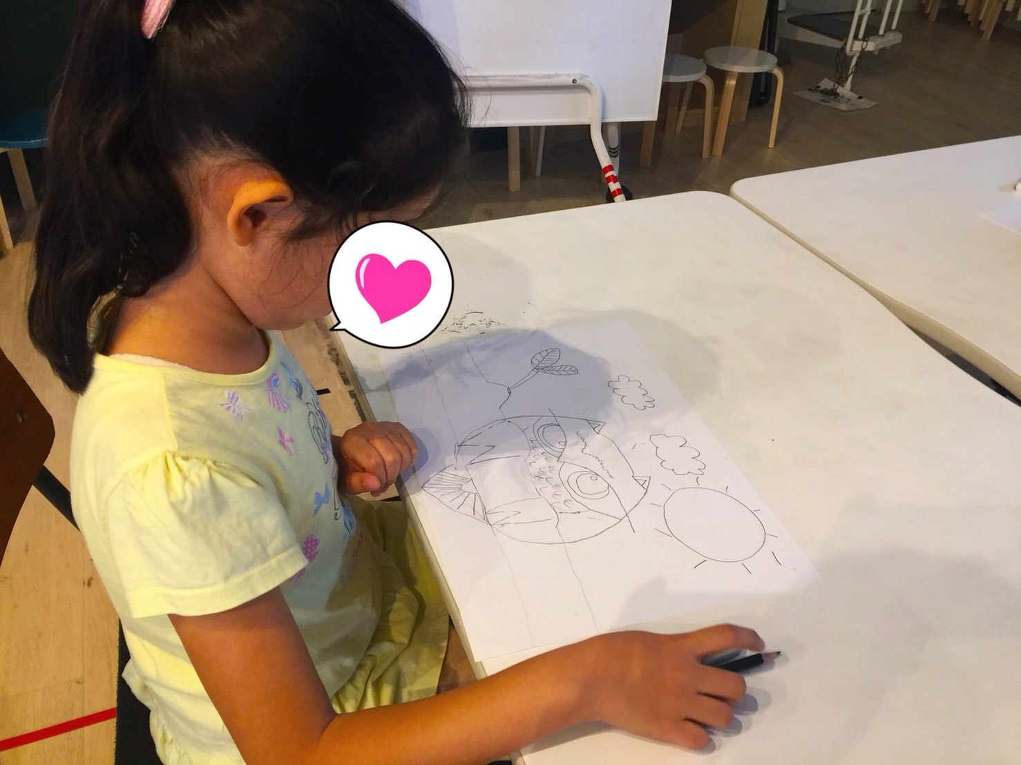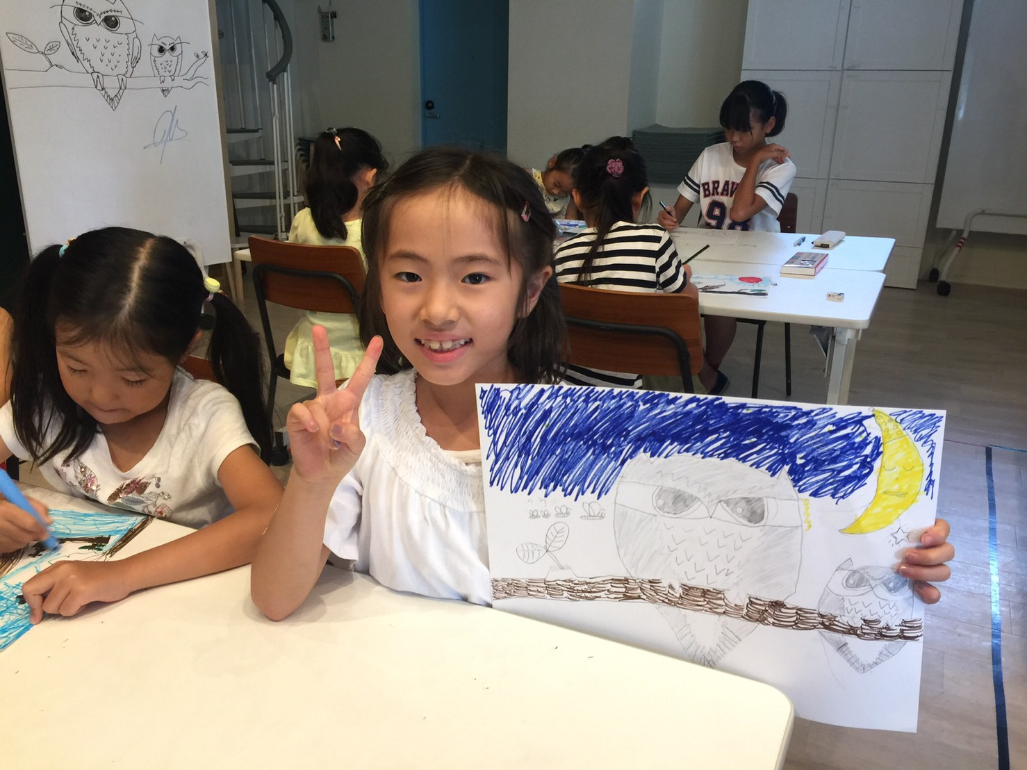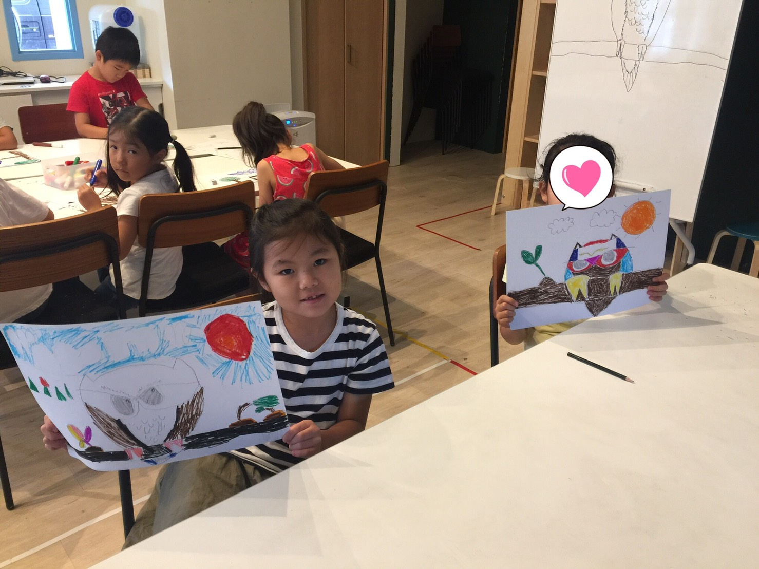 お題の”Owl”(フクロウ)を描き終えたら、空いているスペースに自分たちの好きな物を描いてたり、色を塗りました。