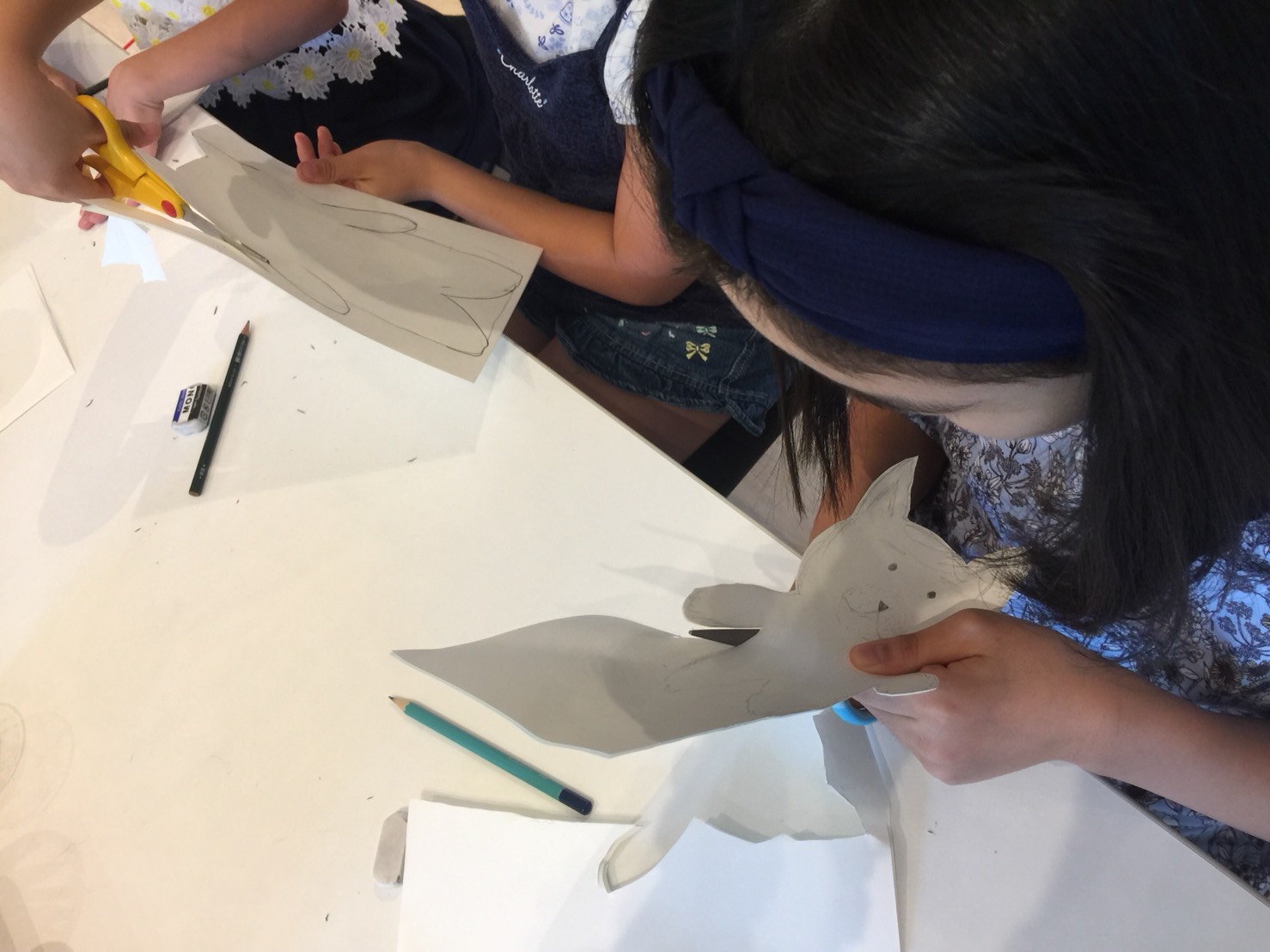 描いた絵に色を塗って装飾をしたら、輪郭に沿ってハサミで切ります。