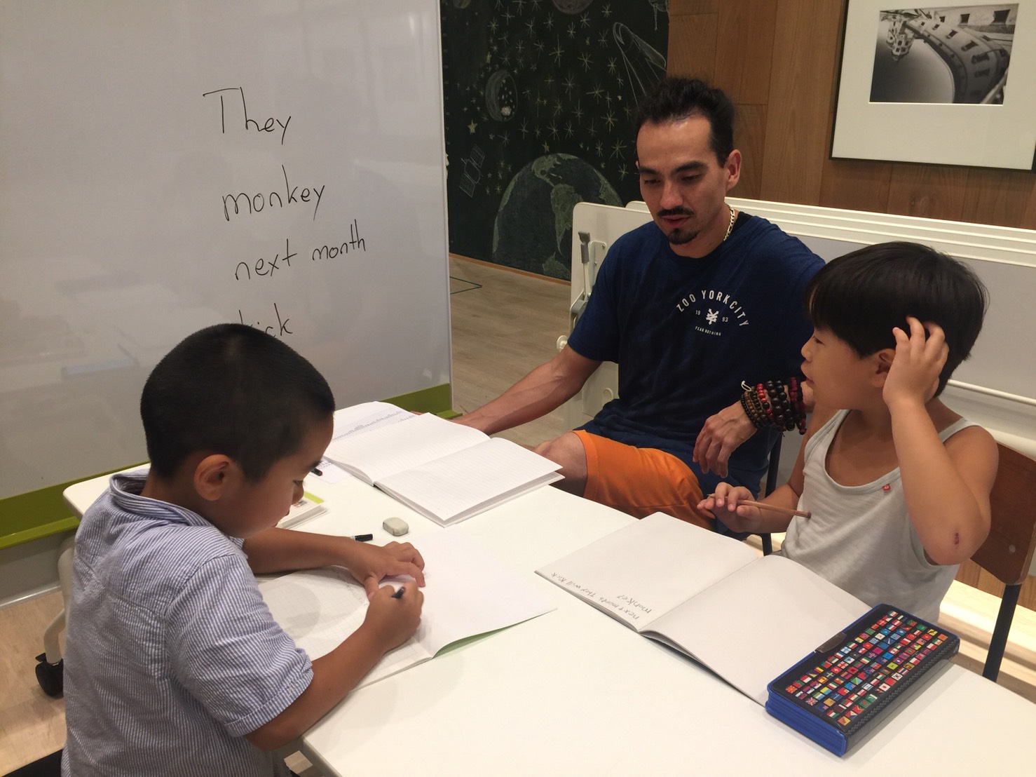 チームごとに座って、お互いにヘルプをし合いながら、先生にも手伝ってもらいながら書く練習をしました。