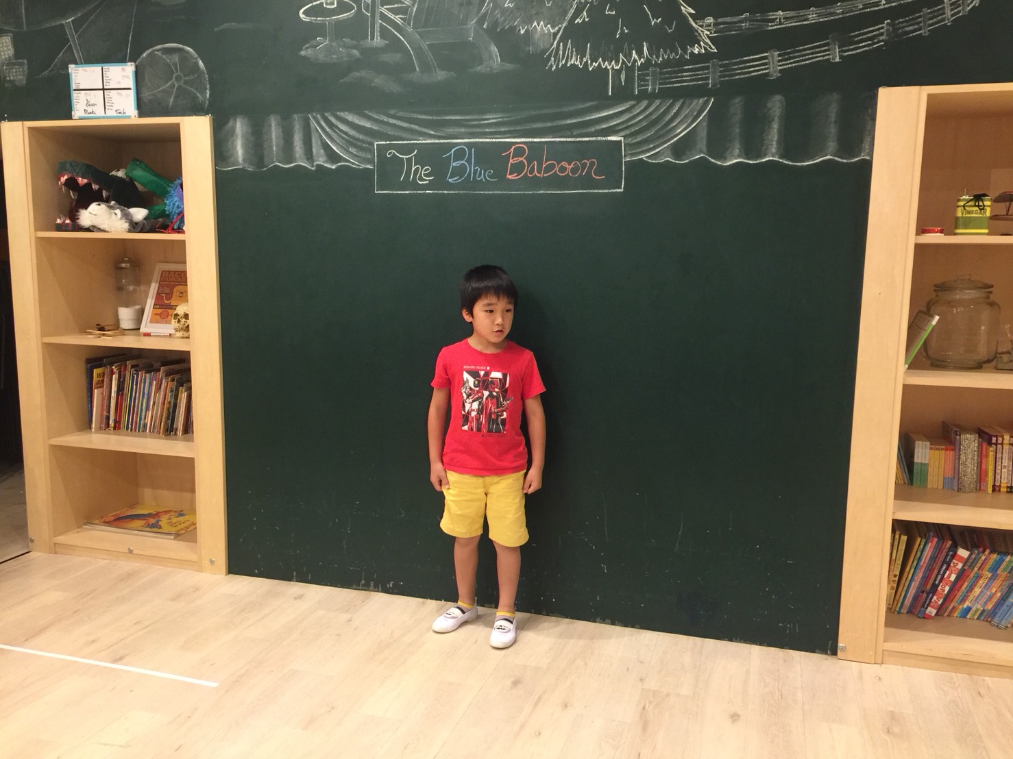 One day, a blue baboon dropped from the trees and said, “Hello.”