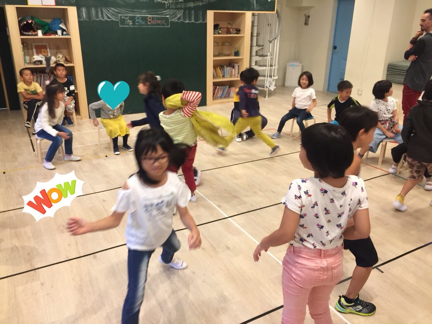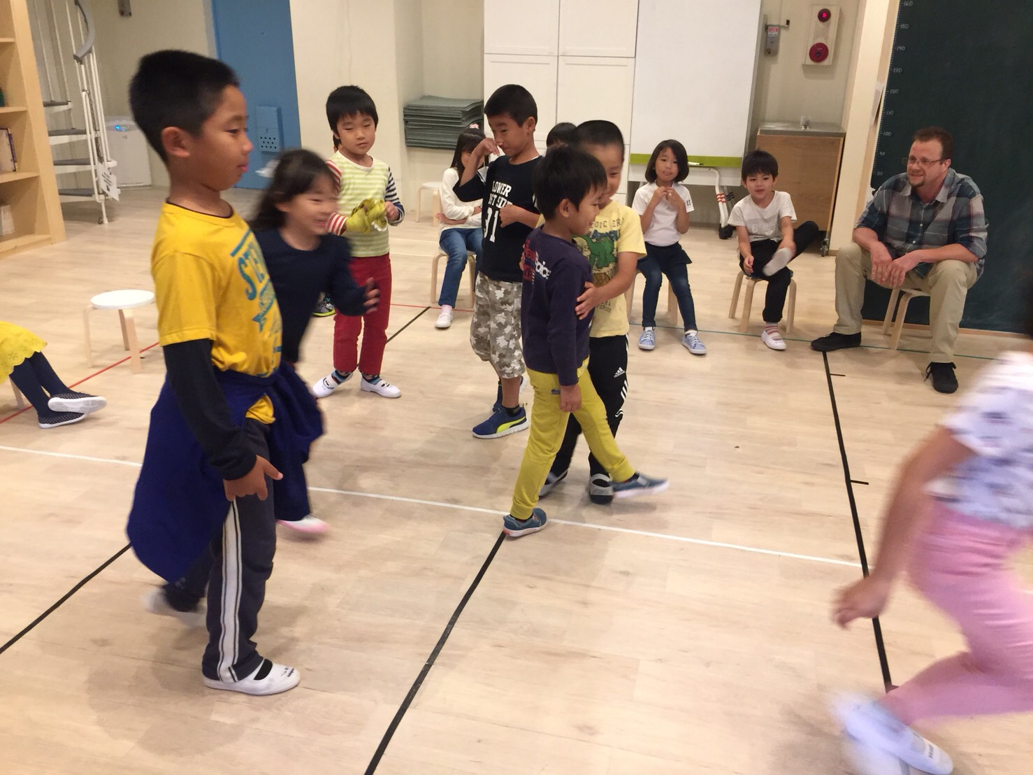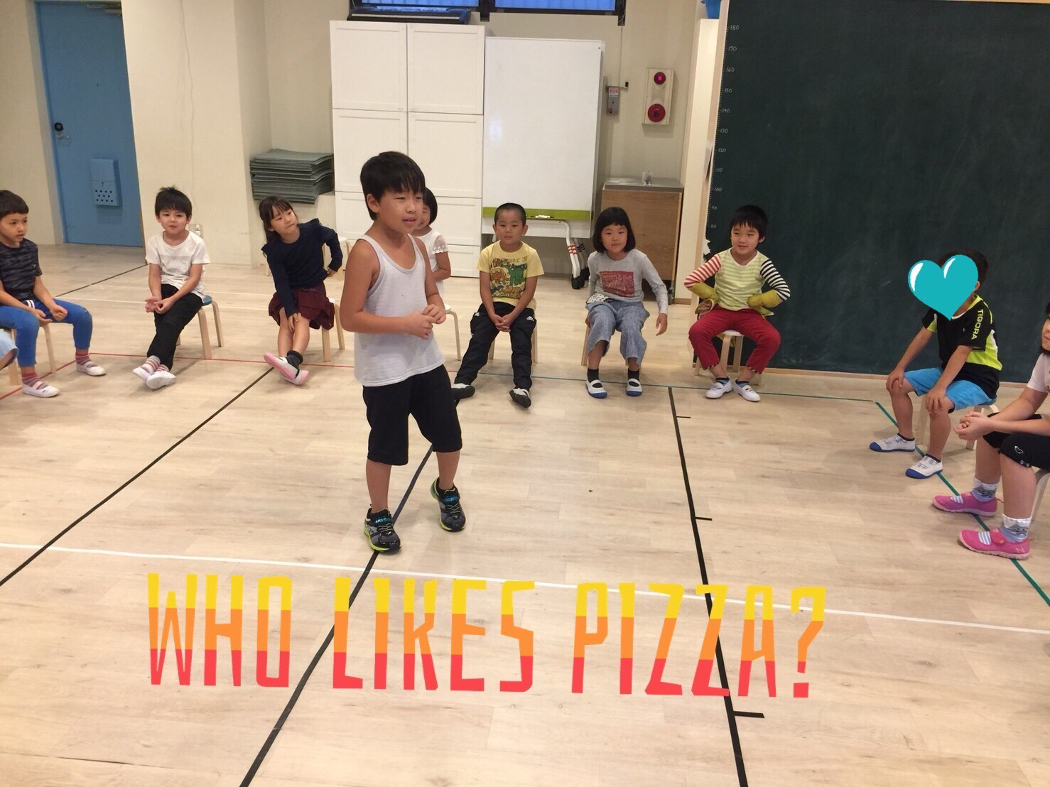 みんな、元気に来校をしてまずは”Who likes ____?”(○○が好きな人?)と”Who doesn’t like ____?”(○○が好きじゃない人?)のイス取りゲームのキッズパスポートバージョンゲームで盛りあがりました。“Who likes pizza?”(ピザが好きな人?)