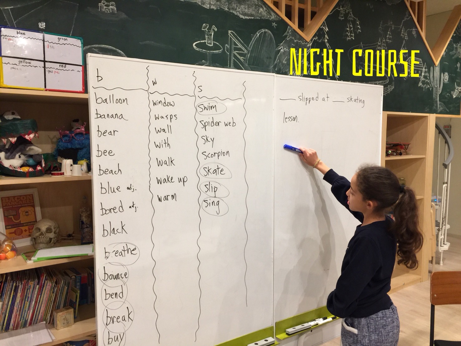 ナイトコースは英検対策コースでした。既存生徒さんが成長してくるにつれ、会話だけでなく文法や読み書き等、ある程度法則やロジックを通じて学ぶレッスンです。お互いに刺激し合いながら、会話をしながら文法も楽しく学べるレッスンとなっています。さらに会話にも広がりがでるようになることを目標としています。みんなレギュラーの時間とは違った勉強にも集中して取り組んでいました。