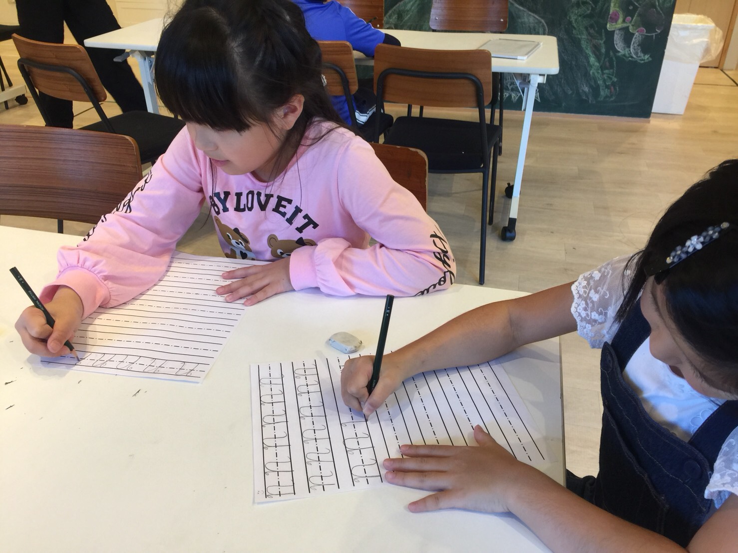 先生のお手本を見ながら、書き方のこつを教えてもらいながら、みんなも実際に書いてみました。