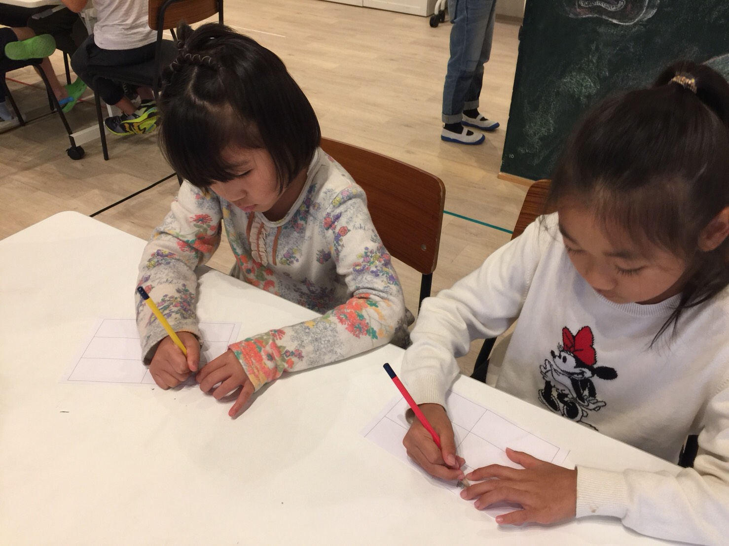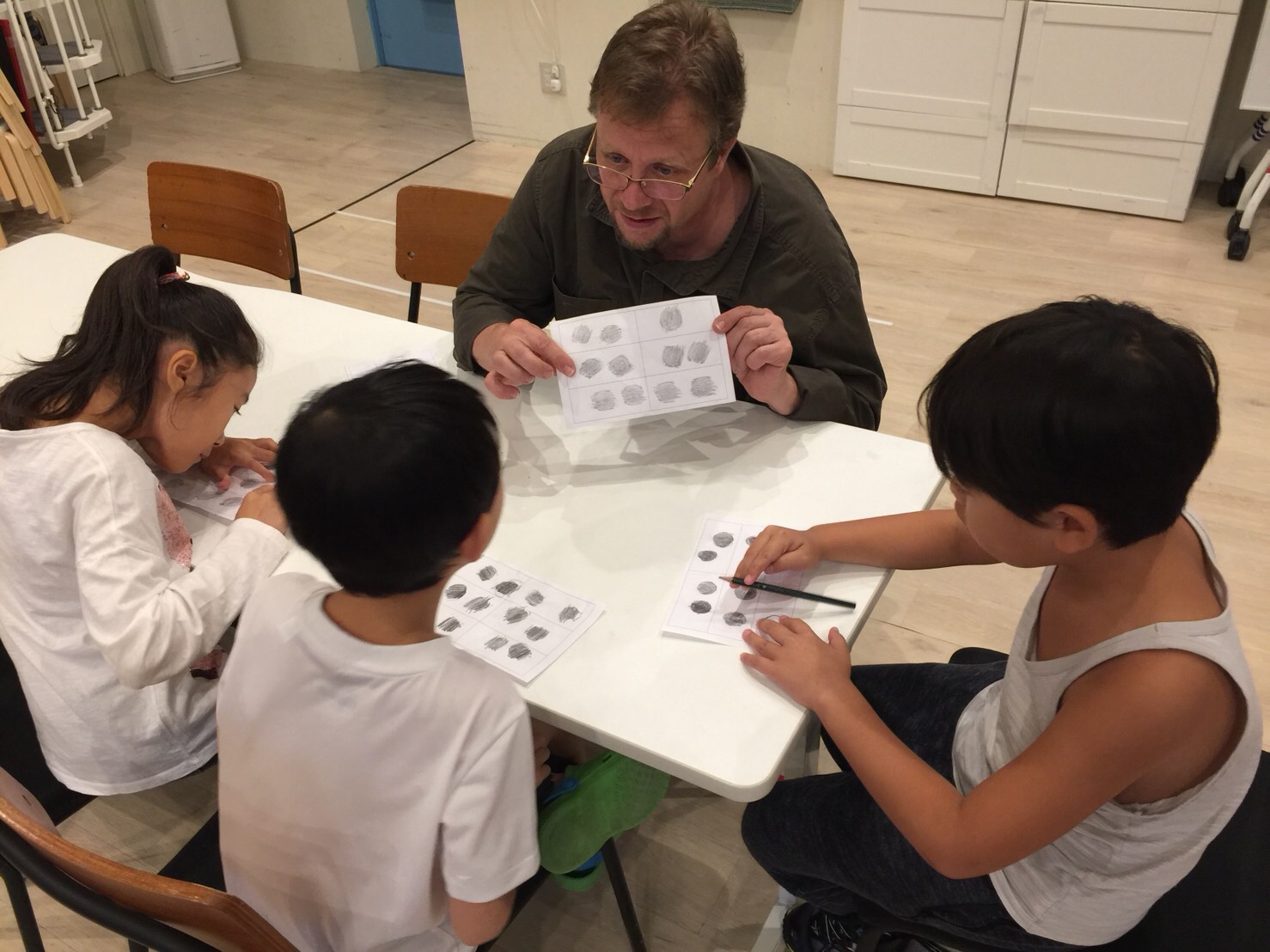 早めにきた生徒さんたちは、いろいろな国のコインの上に紙を置き、鉛筆でなぞって写し絵をつくりました。