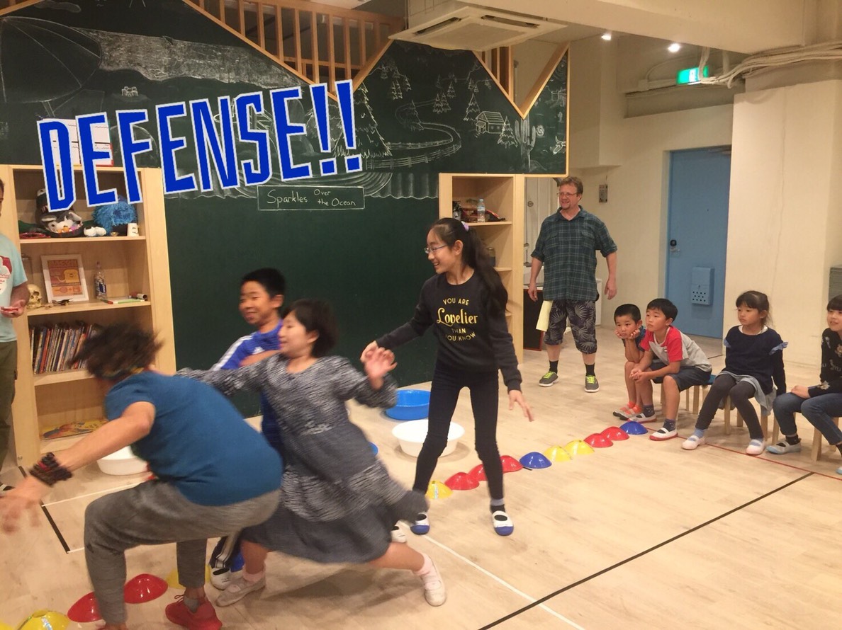相手チームのディフェンダー達が”Defense!”(ディフェンス!)をしてくるので、かわしながらボールをバケツに入れられたら”One point for your team!”(チームに1ポイント!)