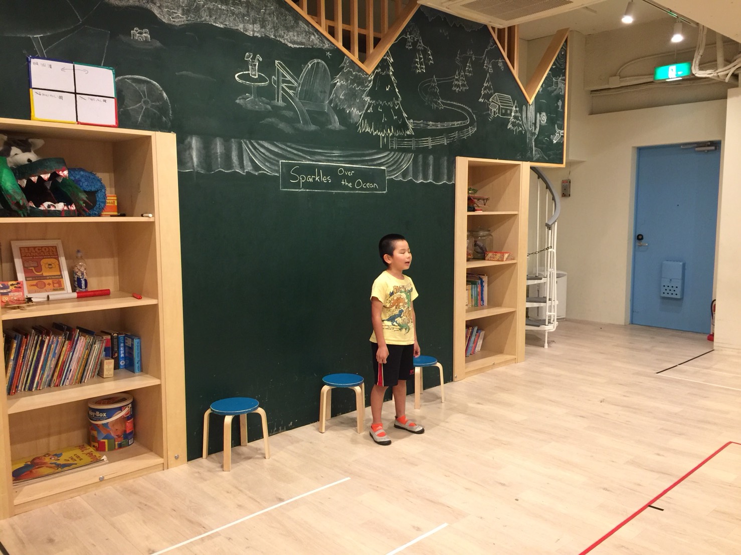 描き終わったら、先生が絵を集めてランダムにホワイトボードに貼って行きます。