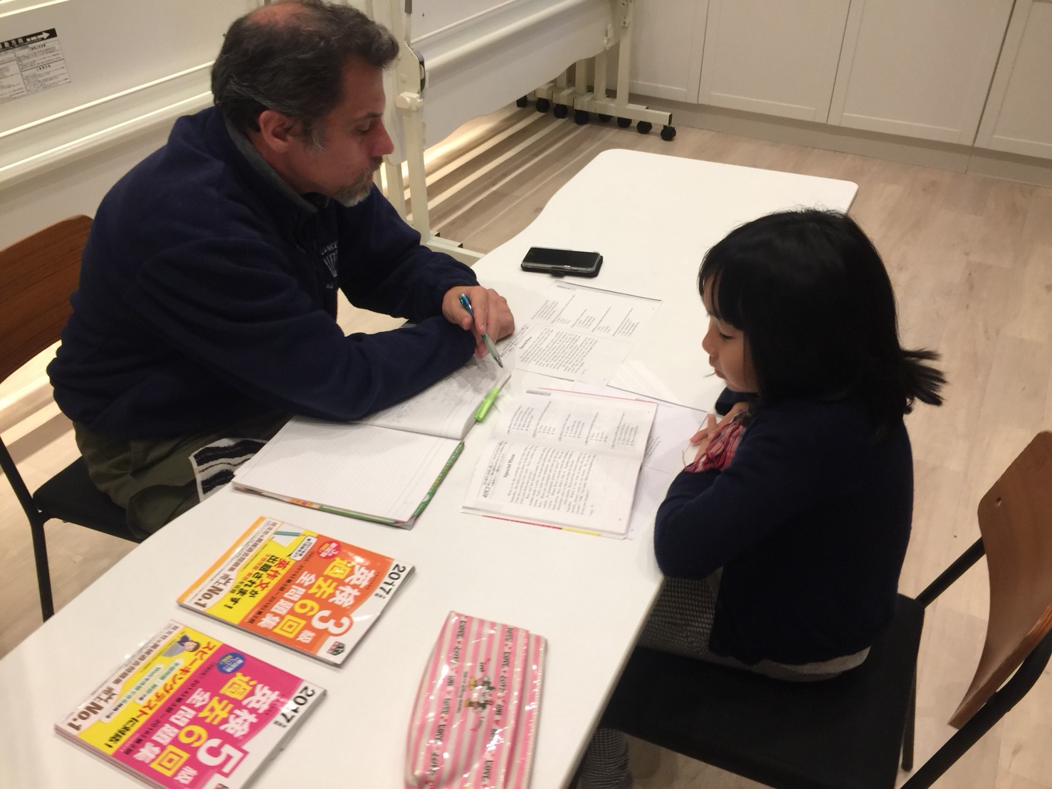 各チームから一人ずつ前に出て、先生の出すお題にそった絵を描きます。I want you to draw ____.(○○を描いて)