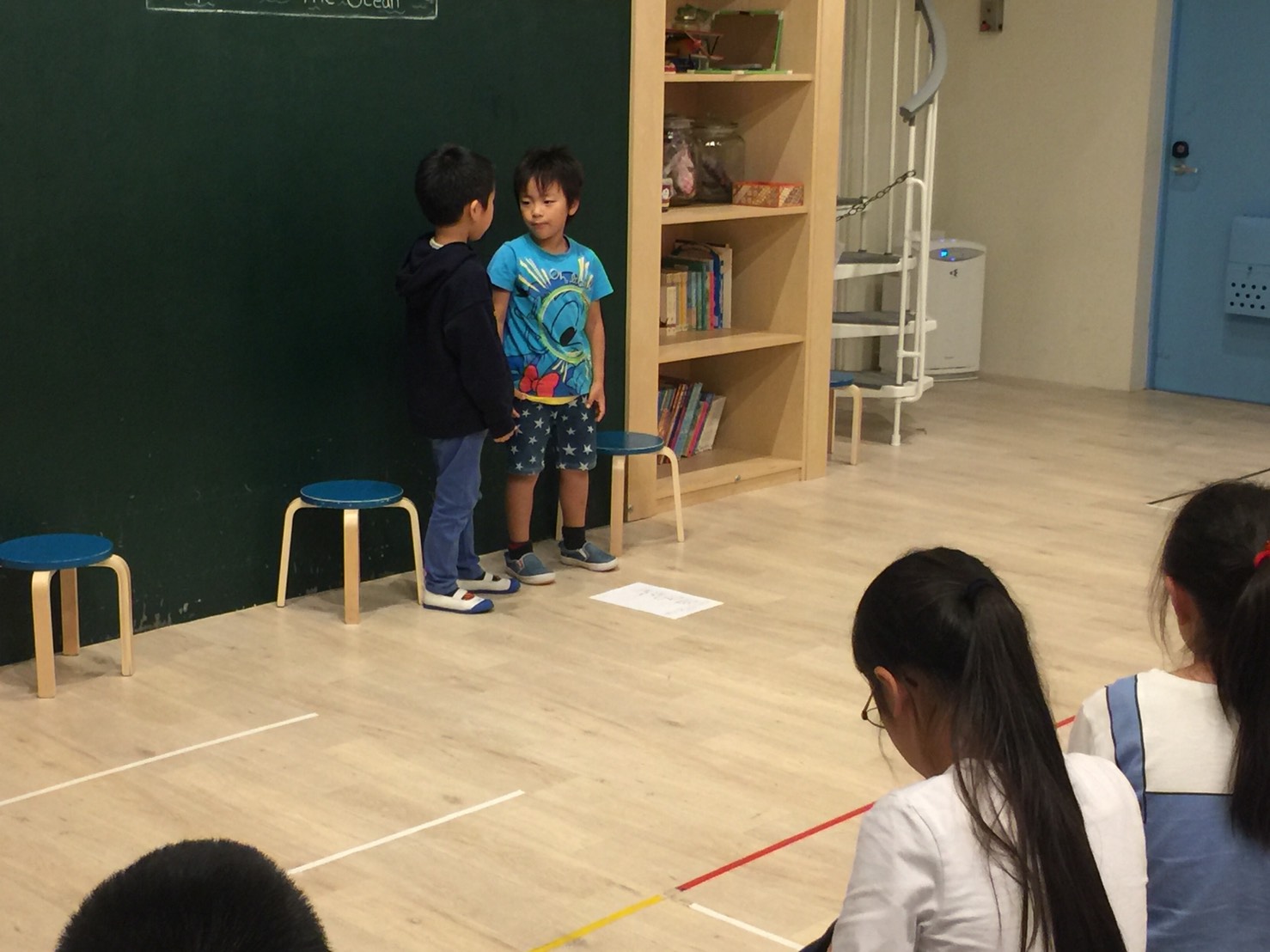 各チームから一人ずつ前に出て、先生の出すお題にそった絵を描きます。I want you to draw ____.(○○を描いて)