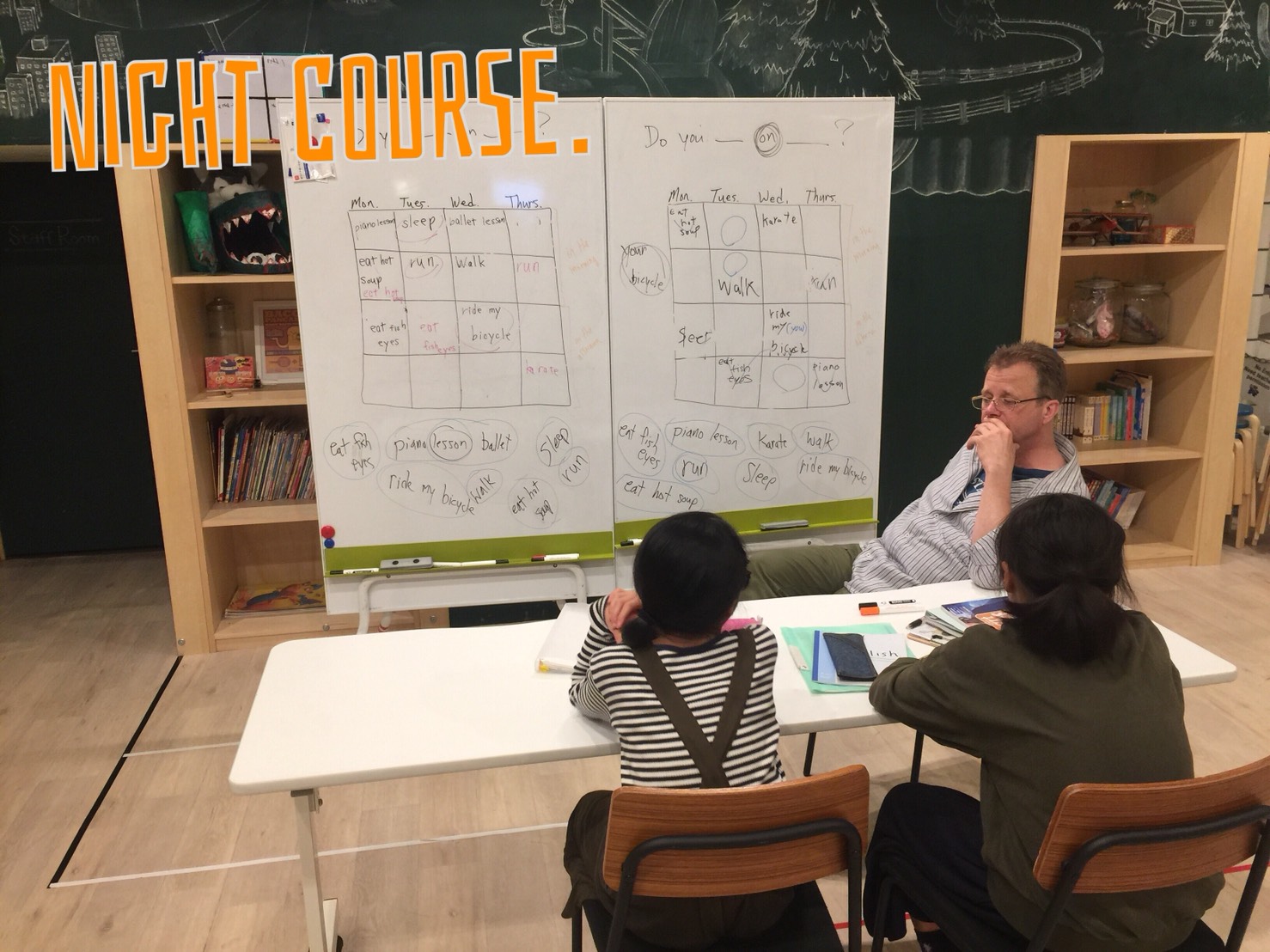 描き終わったら、先生が絵を集めてランダムにホワイトボードに貼って行きます。