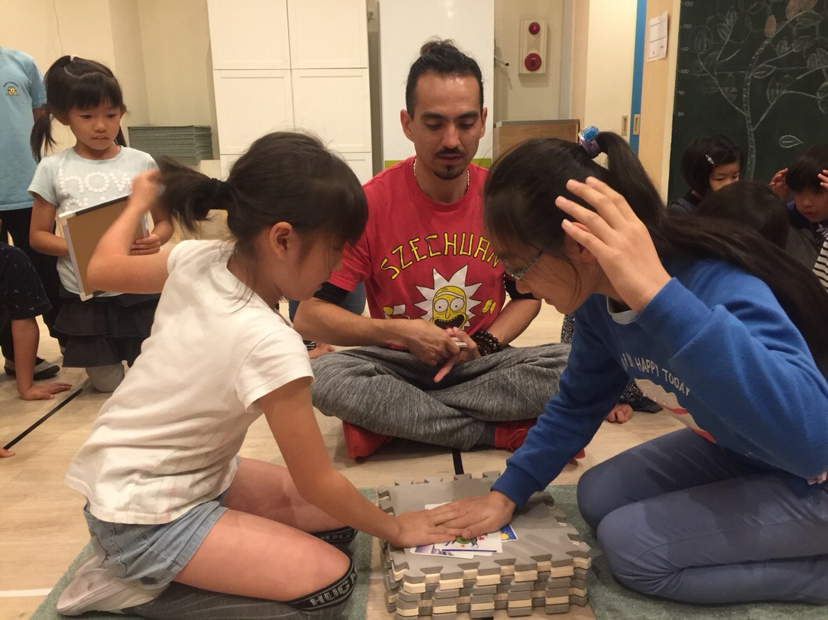 Slam(強くたたく)とSandwich(サンドウィッチ)を合体させた名前の単語ゲームです。2人で向き合って座り、先生が置くカードの単語を順番に言って行き、カードが進んで行き、単語と単語または”Bread card”(パンのカード)に挟まれた時にカードを”Slam!!”(強くたたく)します。