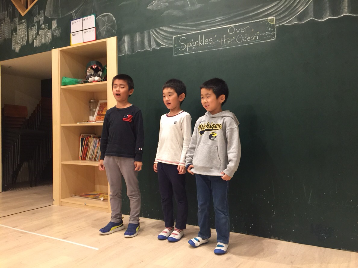 大きなボードに貼ってある単語を選んで、大きな声で言います。