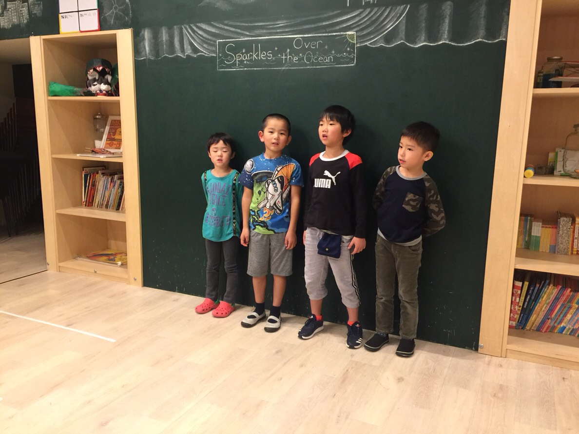 大きなボードに貼ってある単語を選んで、大きな声で言います。