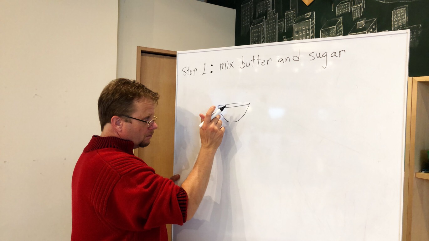 材料と手順を確認しながら、みんながレシピ本を書いている時に先生が同時進行でクッキー生地を作ってくれました。