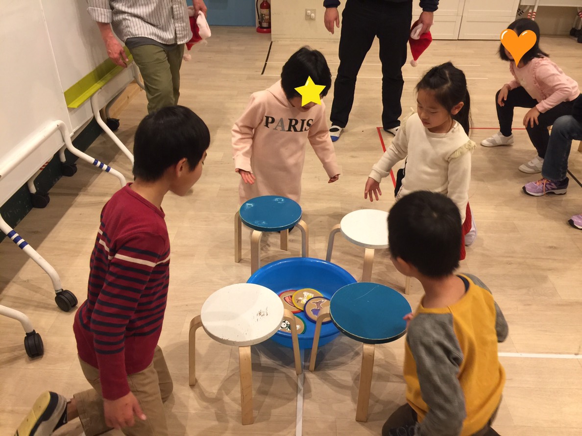 袋の中から、両面に絵の描いてある丸いボードを選んで”Flip”(はじく)し、出た絵のポイント数、前に進んだり、後退したり。