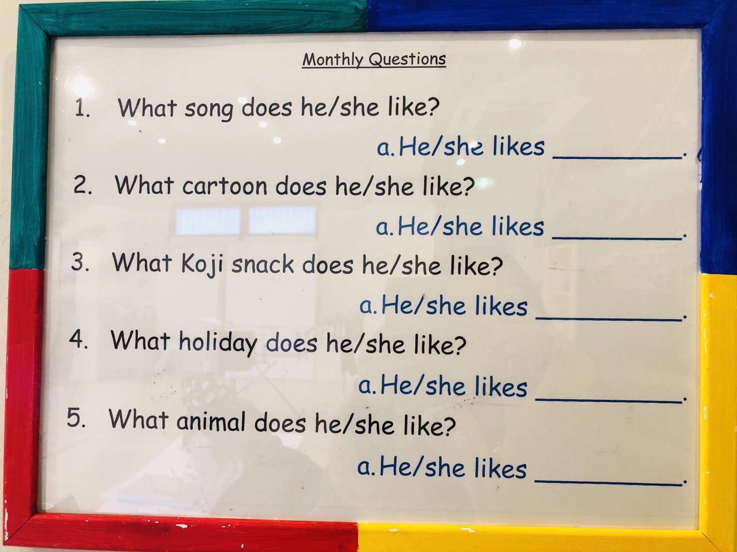 アクティビティの合間やスナックタイム、トイレ休憩の後のフリータイムに先生たちや生徒同士でする今月の“Q&A”(質問と回答)の内容です。