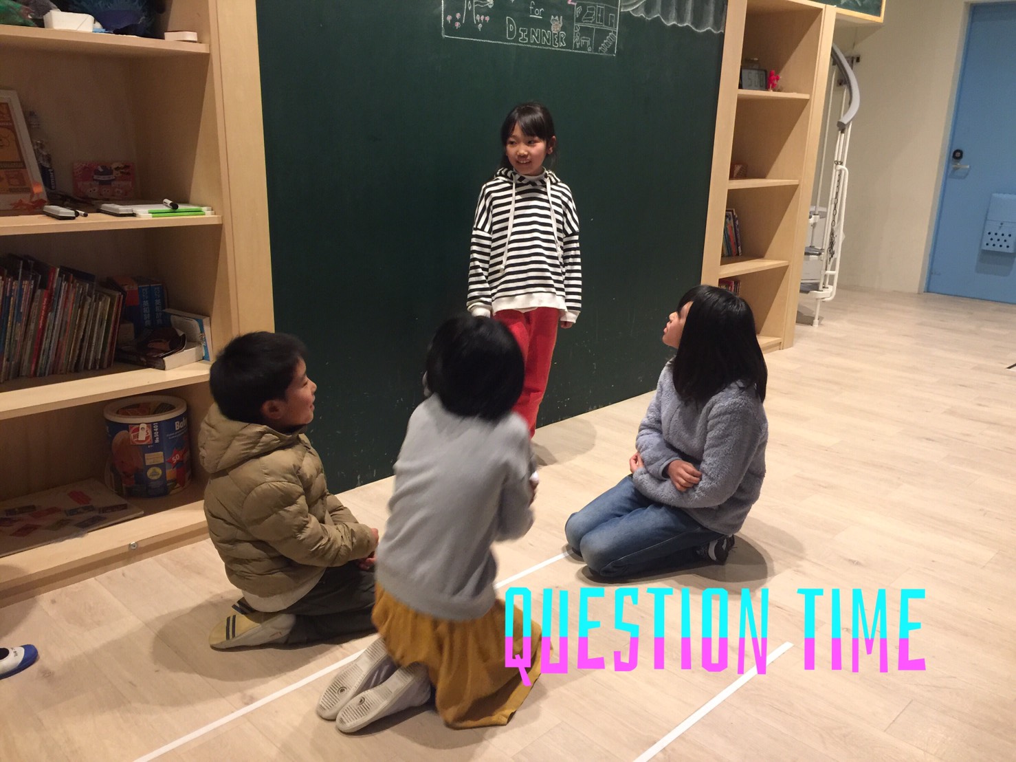ちゃんといろんな人と練習をしているかは”Okay! Question time!”(質問の時間です!)と先生たちがランダムにチェックするからね。