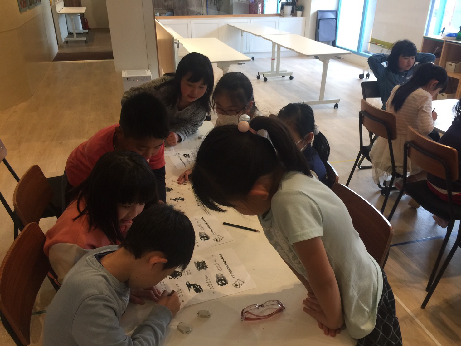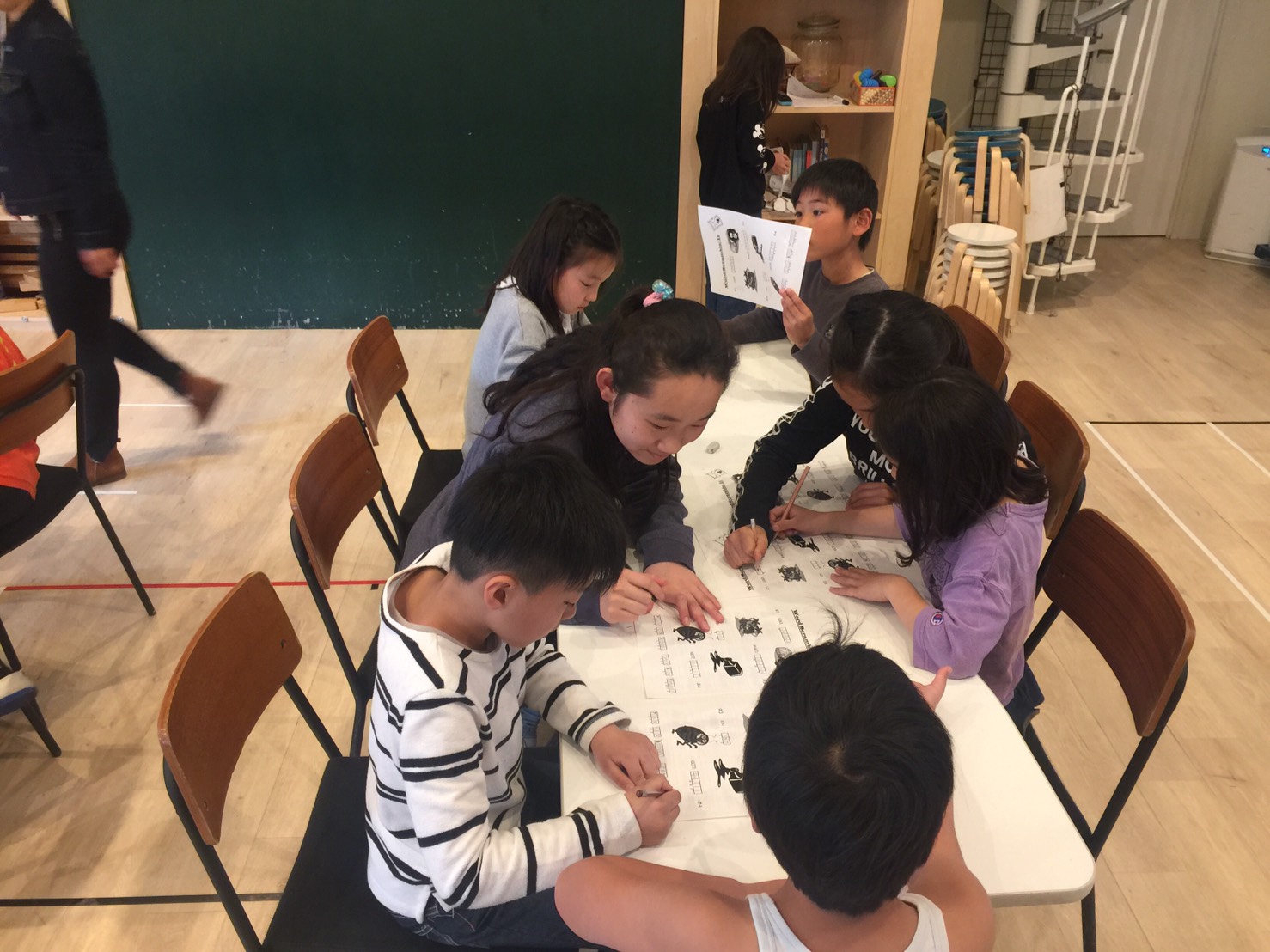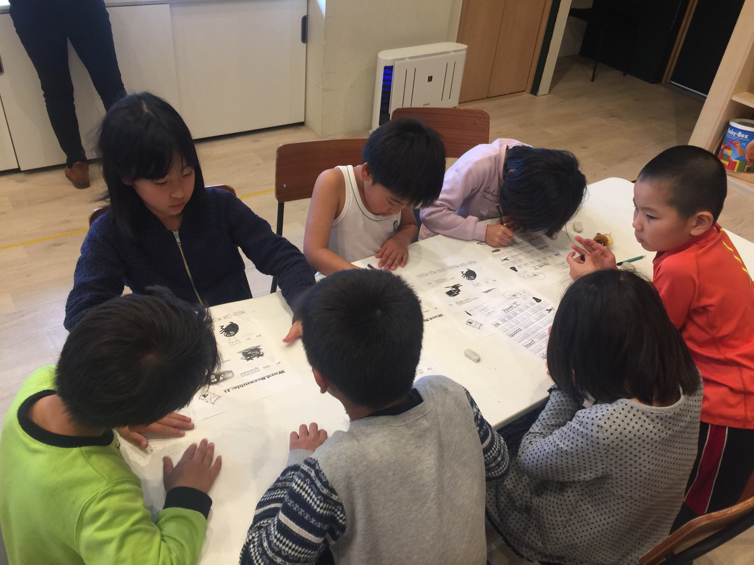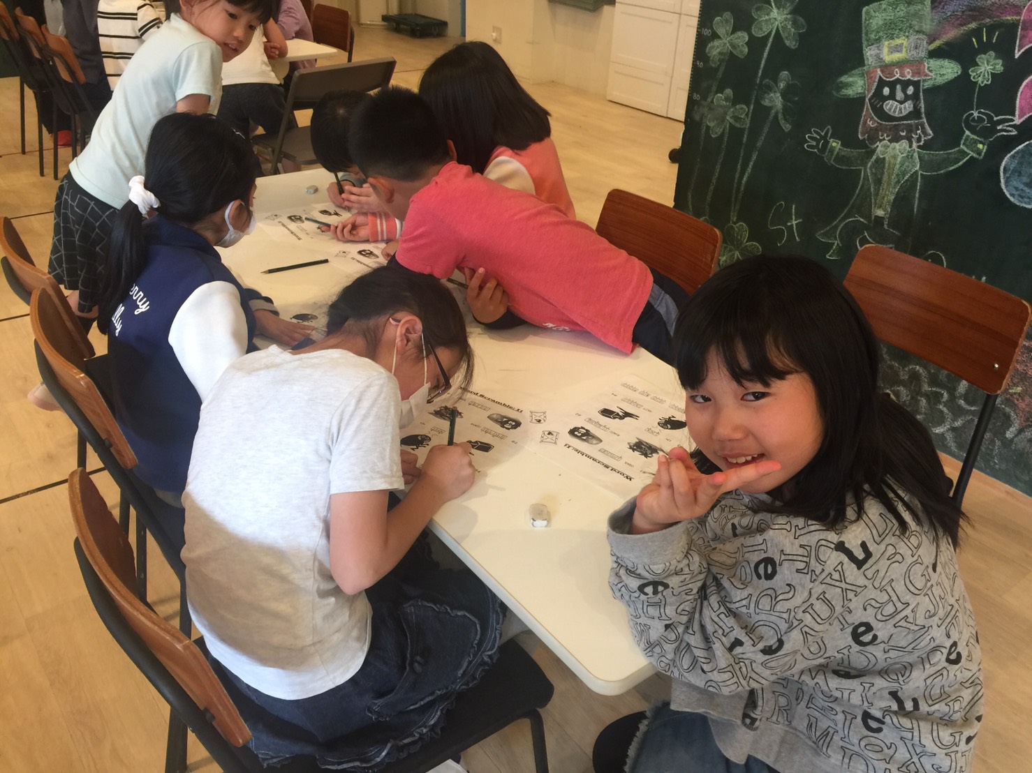 英語圏の幼稚園や小学校などで使われている、読み書きや発音を向上させるための「フォニックス」を使って音と文字をリンクさせる練習をしながらライティング。