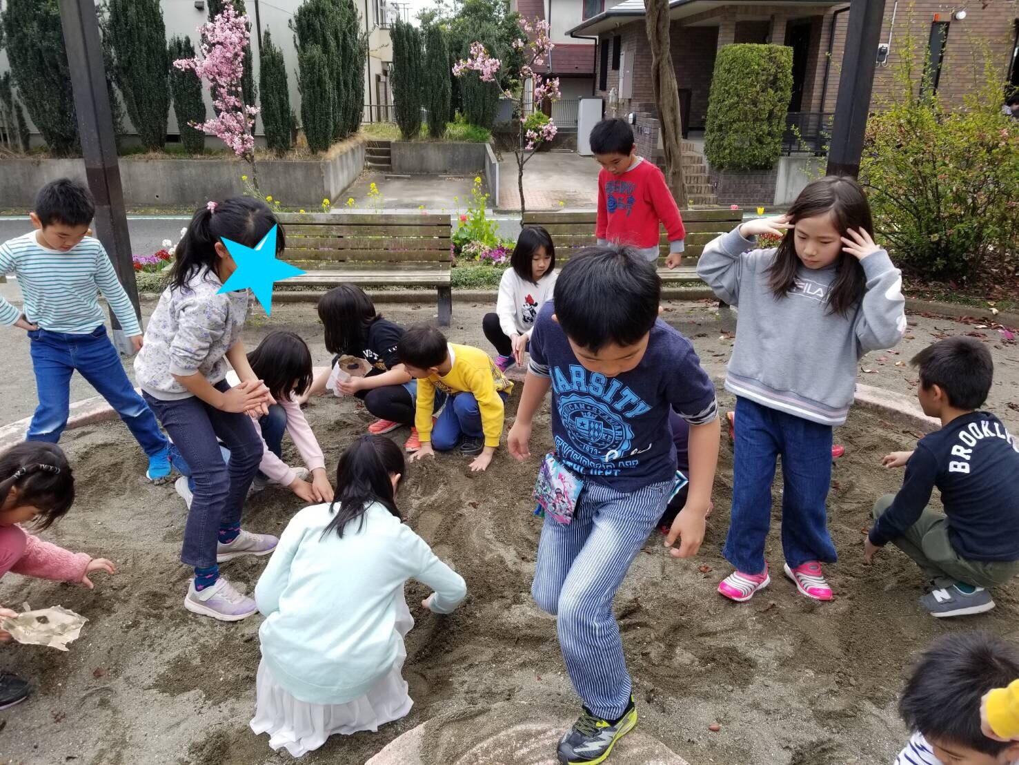 近所の公園にあらかじめ先生が隠してくれた”Treasure”(宝物)を探しに出かけました。