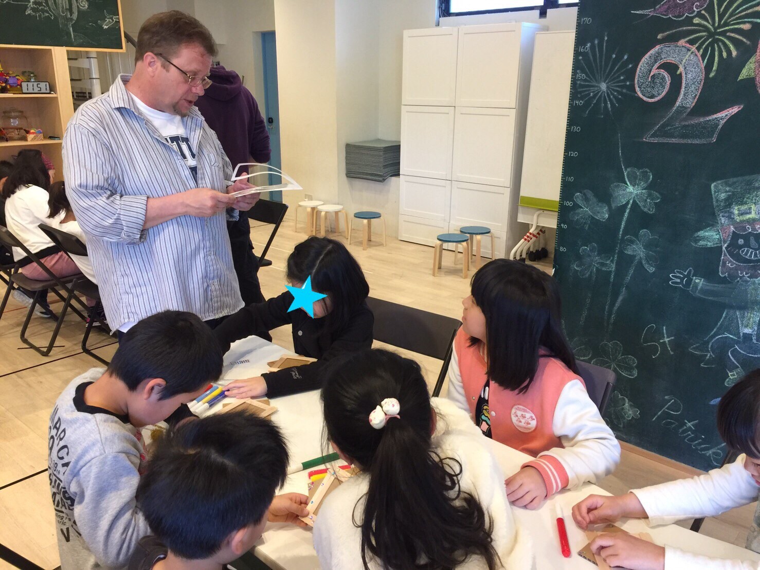 先生が用意してくれたアイスの棒で枠を作り、自由にいろいろな飾り付けを行いました。
